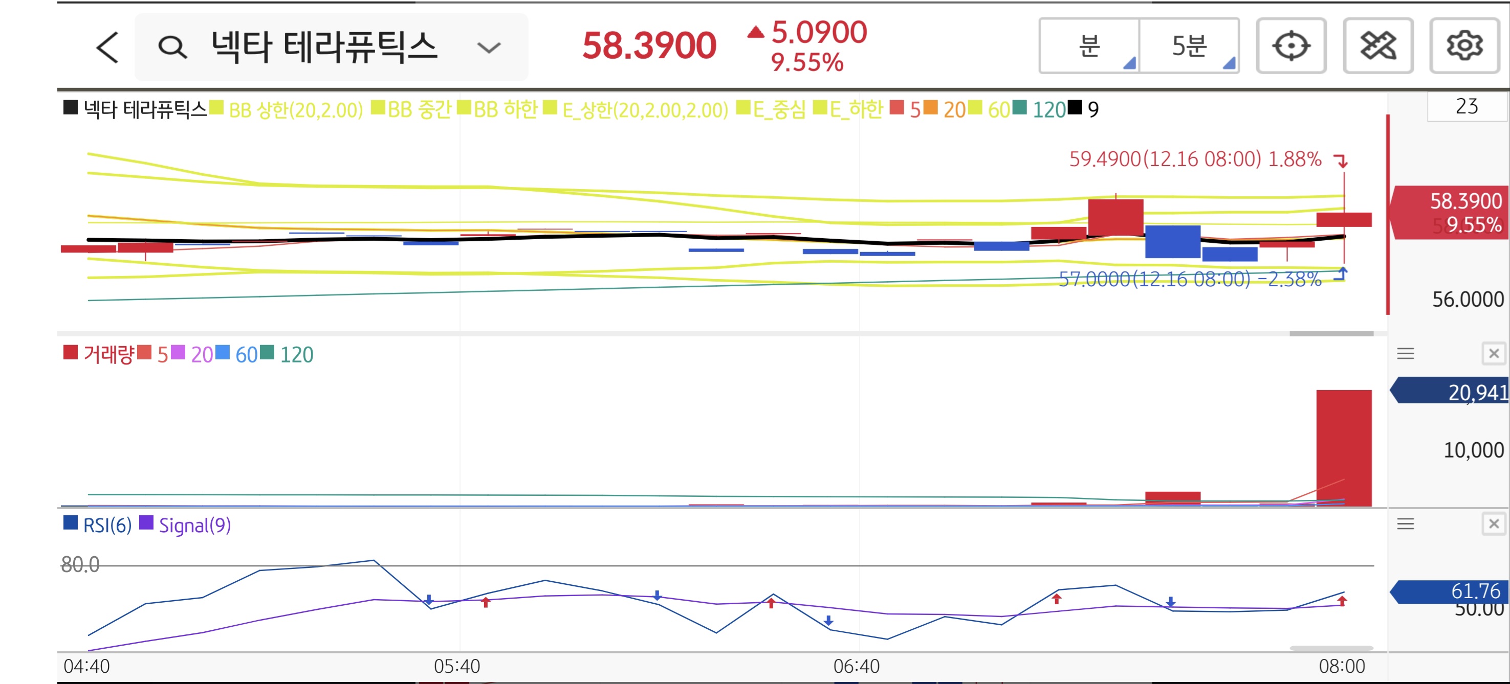 차트가 정말 견고합니다. 시초가 갭상승 이후 $58.00 라인을 훼손하지 않고 고가 놀이(High Base) 패턴을 만들고 있습니다. RSI가 과매수 구간에 있지만 주가가 빠지지 않는다는 건, 매도세보다 매수 대기 물량이 더 강하다는 증거입니다. 5일선 타고 우상향할 차트입니다.