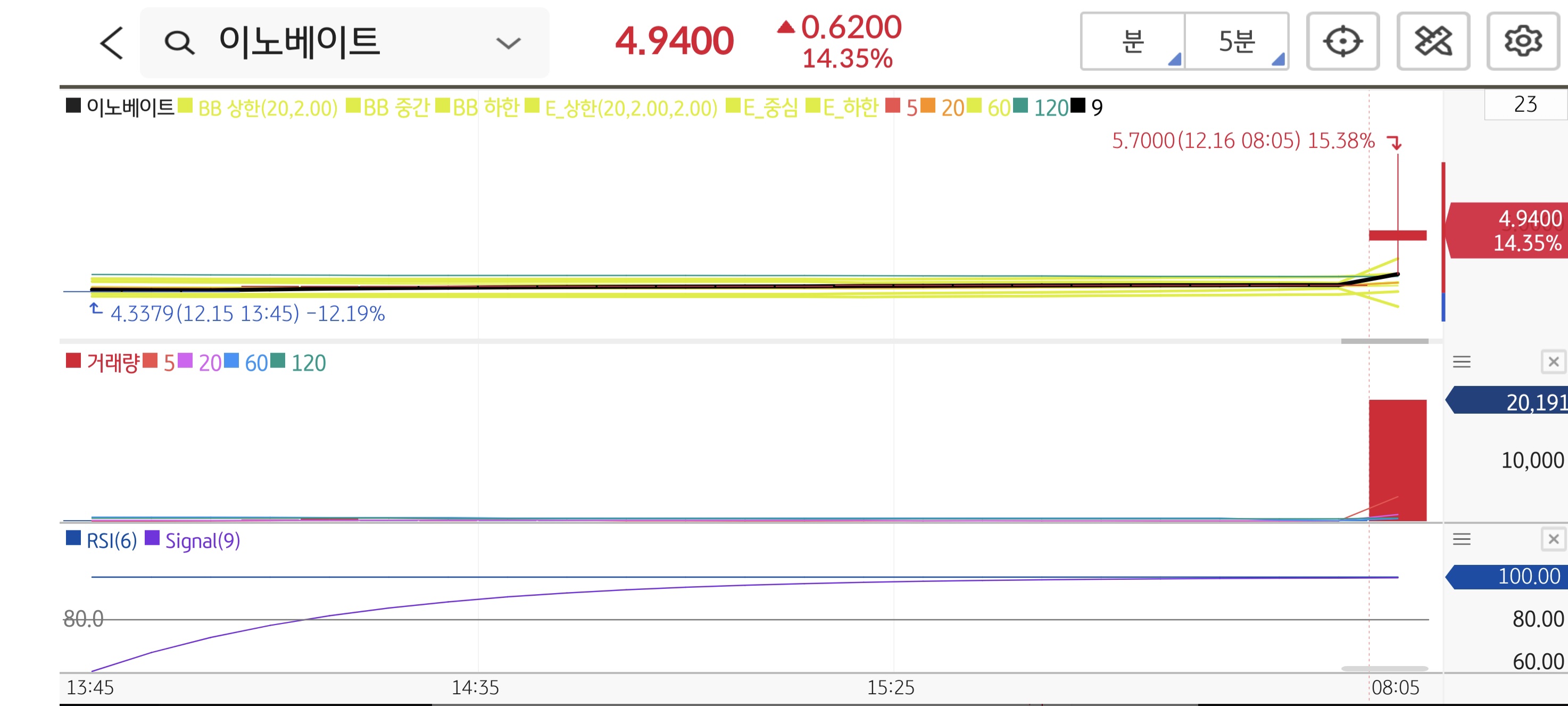 프리마켓에서 $5.70까지 쐈다가 시초가 이후 $4.94 부근에서 숨 고르기 중입니다. 중요한 건 거래량이 터진 장대양봉의 허리 라인을 지키고 있다는 점입니다. 급등 피로감을 해소하며 매물을 소화하는 '건전한 조정'으로 보입니다. 전고점($5.70) 재돌파 시도가 나올 확률이 매우 높습니다.