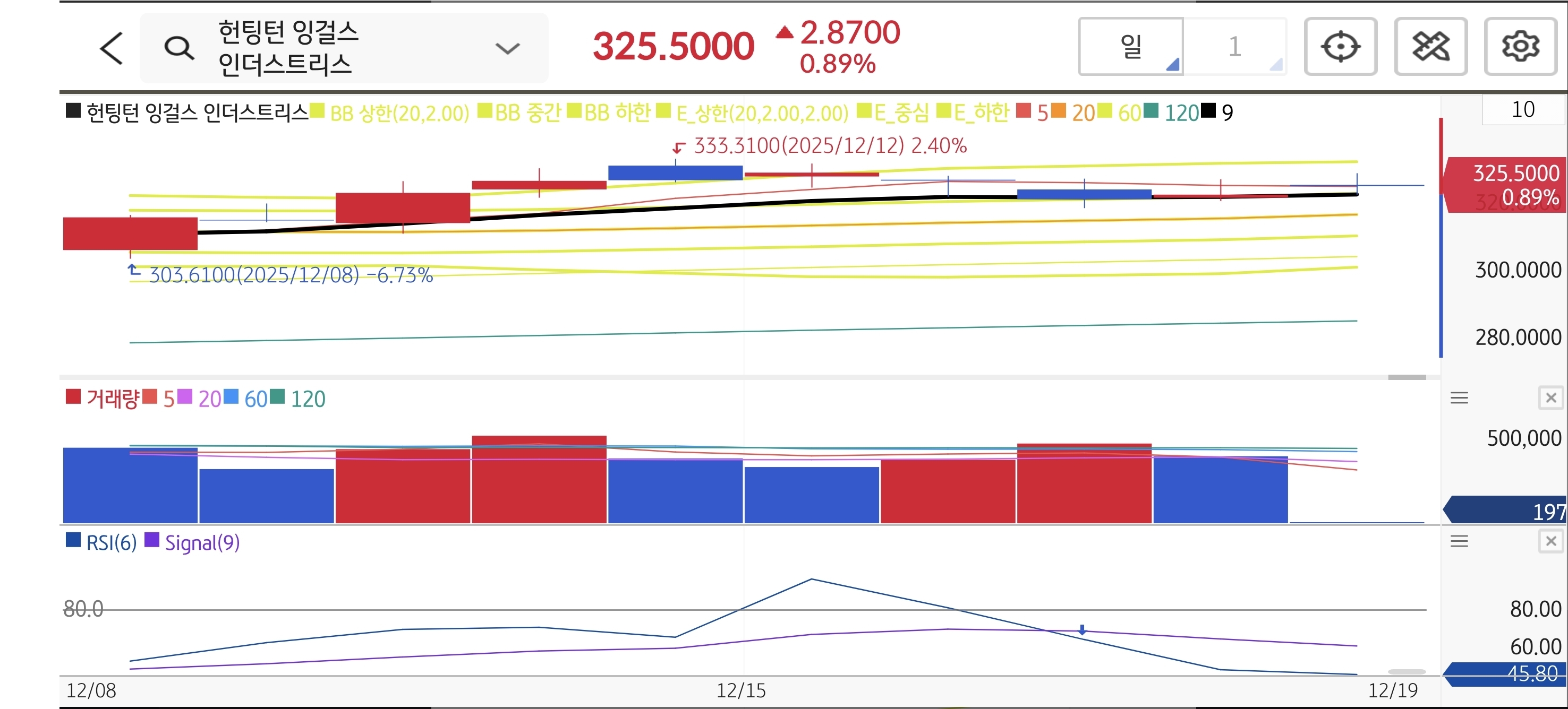 일봉상 모든 이동평균선이 완벽한 정배열을 이루며 우상향하고 있습니다. 최근 $333 고점을 찍고 $325 부근에서 건전한 기간 조정을 거치고 있으며, 20일선의 지지를 받고 있어 이번 수주 뉴스를 발판으로 전고점 돌파(Breakout)를 시도할 가능성이 매우 높습니다.