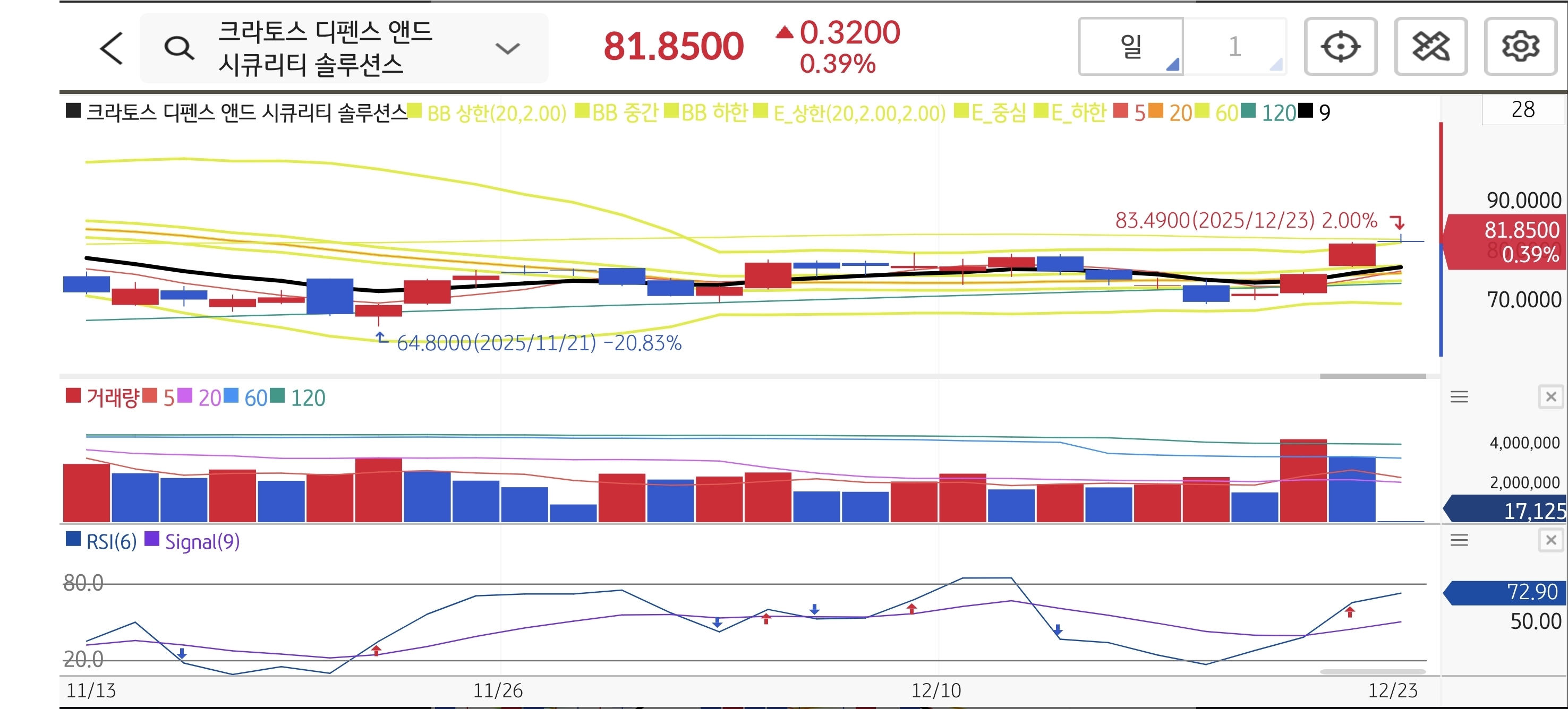 일봉상 오랫동안 역배열 하락세를 이어오다 최근 $70 초반에서 쌍바닥을 형성했습니다. $83.49 고점 이후 조정을 받았으나, 20일선이 고개를 들며 60일선 돌파를 목전에 두고 있습니다. 이번 수주 뉴스는 60일선($80 초반)을 강하게 뚫어내며 정배열 초입으로 진입시키는 트리거가 될 것입니다.