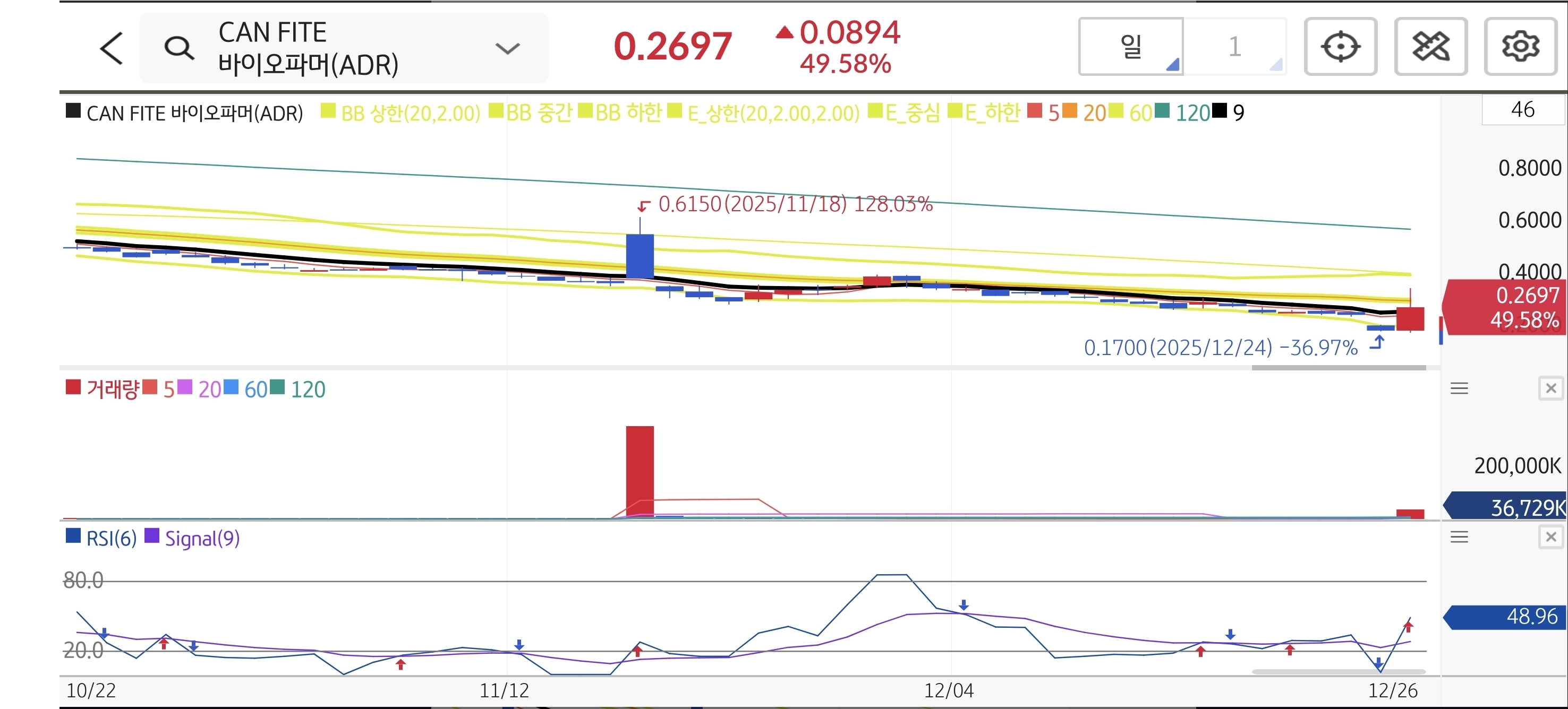 $0.61 고점 대비 -50% 이상 폭락하며 $0.17 신저가 부근까지 밀린 전형적인 투매 구간입니다. 하지만 과매도(RSI 30 이하) 상태에서 터진 이번 특허 뉴스는 기술적 반등의 기폭제가 되기에 충분합니다. 5일선을 강하게 돌파하며 20일선($0.30 부근)까지의 갭을 메우러 갈 가능성이 높습니다.