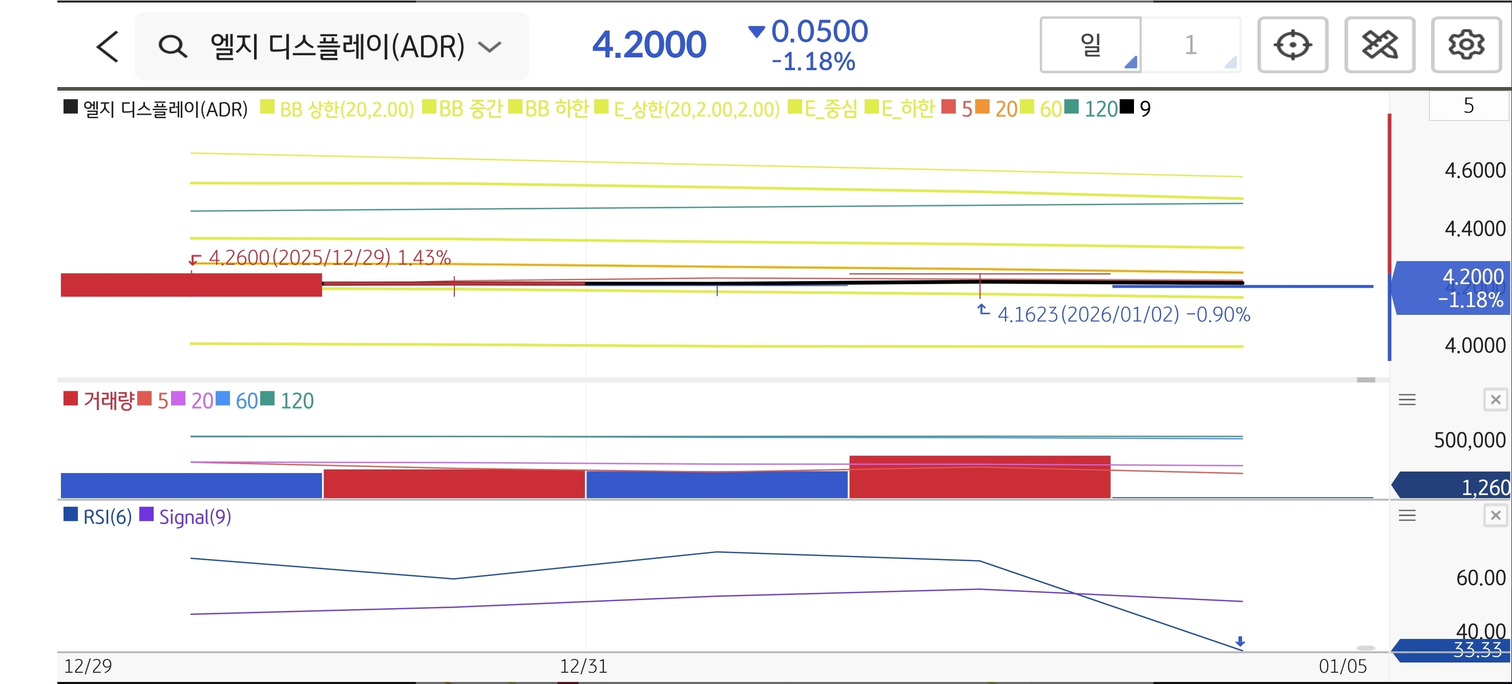 - 📈 기술적 패턴: 완만한 '우상향 채널'을 형성하고 있습니다. 뉴스 발표 직후 눌림목($4.16)을 형성한 뒤, 저점을 꾸준히 높이며 5일선을 타고 올랐습니다. 1월 초 CES 기대감과 맞물려 매수세가 점진적으로 유입되는 모습입니다.