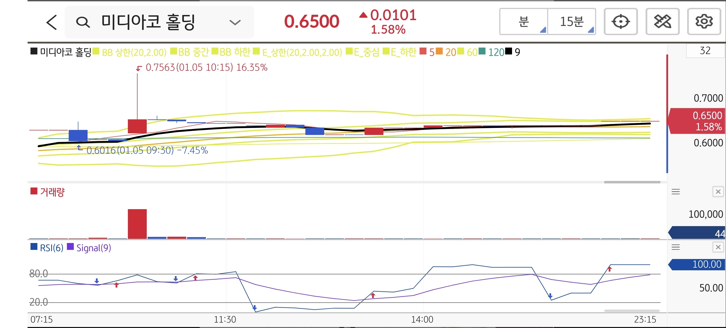 EstrellaTV와의 전략적 제휴 뉴스가 동전주(Penny Stock) 특유의 폭발력을 이끌어냈습니다. 시초가가 $0.6016으로 진입 추천가 밴드 상단 부근에서 시작했고, 장 초반 거래량이 터지며 단숨에 $0.7563까지 치솟았습니다. 이는 제시했던 1차 목표가($0.70)를 초과 달성한 수치입니다. 이후 차익 실현 매물로 윗꼬리를 달았지만, 정확한 타점 공략으로 충분한 수익을 챙길 수 있었습니다.