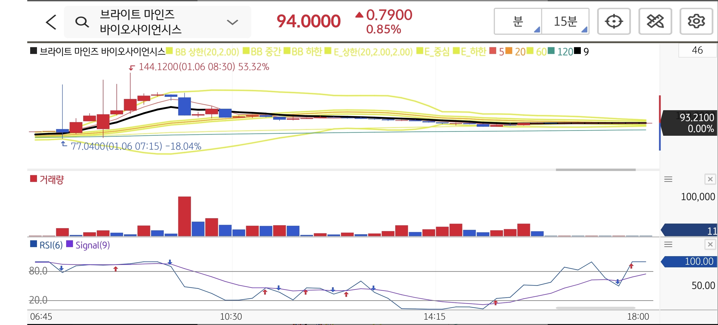 임상 2상 결과 발표로 시초가가 무려 $119.80(+29% 갭상승)에 형성되었습니다. 이는 진입 추천가($100)를 훨씬 초과한 수치로, 원칙상 '추격 매수 금지' 영역이었습니다. 예상대로 시초가 이후 차익 매물이 쏟아지며 $93.21까지 밀렸습니다. 갭상승이 너무 클 때는 관망하는 것이 자산을 지키는 길임을 다시 한번 확인시켜 주었습니다.