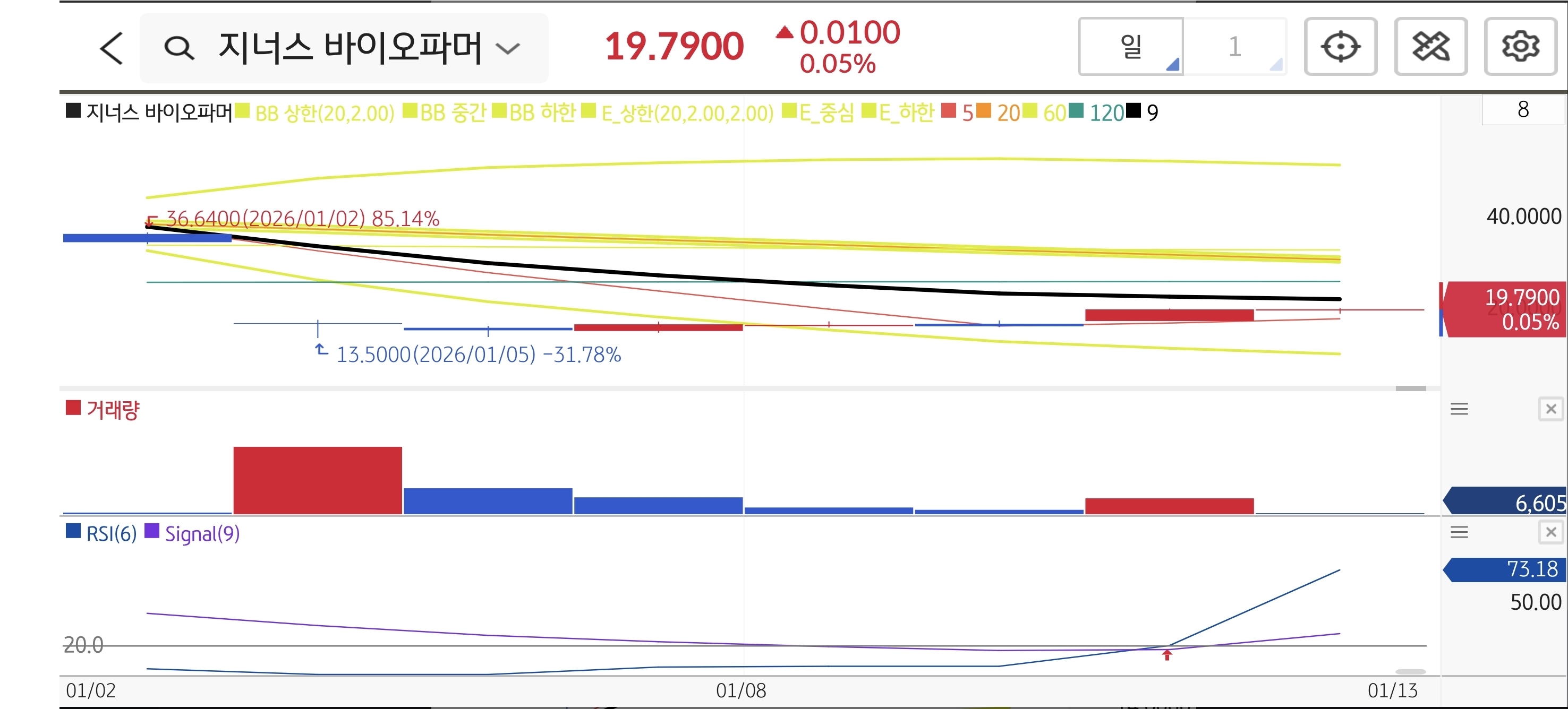 - 📈 기술적 패턴: 임상 보류 해제라는 대형 호재로 장중 급등했으나, 윗꼬리를 길게 단 대량 음봉이 발생하며 마감했습니다. RSI는 48.26으로 중립 구간이나, 상승 추세선인 60일선을 지키지 못하고 흘러내리는 모습입니다.