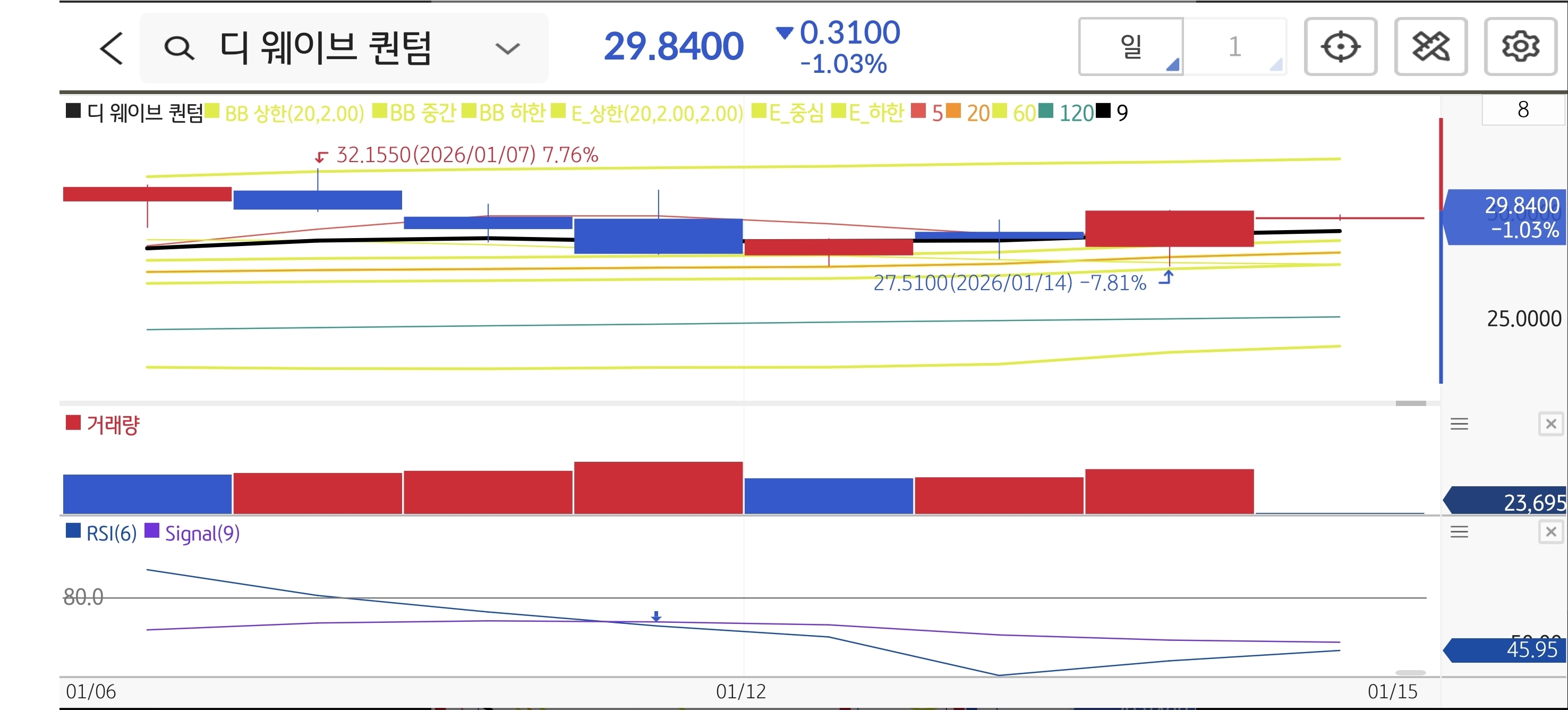 - 📈 기술적 패턴: 양자 컴퓨팅 기업 인수라는 대형 호재로 갭상승 출발했으나, 주가는 20일선과 60일선 사이의 좁은 박스권($27.51~$32.15)에 갇혔습니다. RSI 45.95로 중립 구간이며, 거래량이 실리지 않은 음봉이 연속 출현하며 모멘텀이 둔화되었습니다.