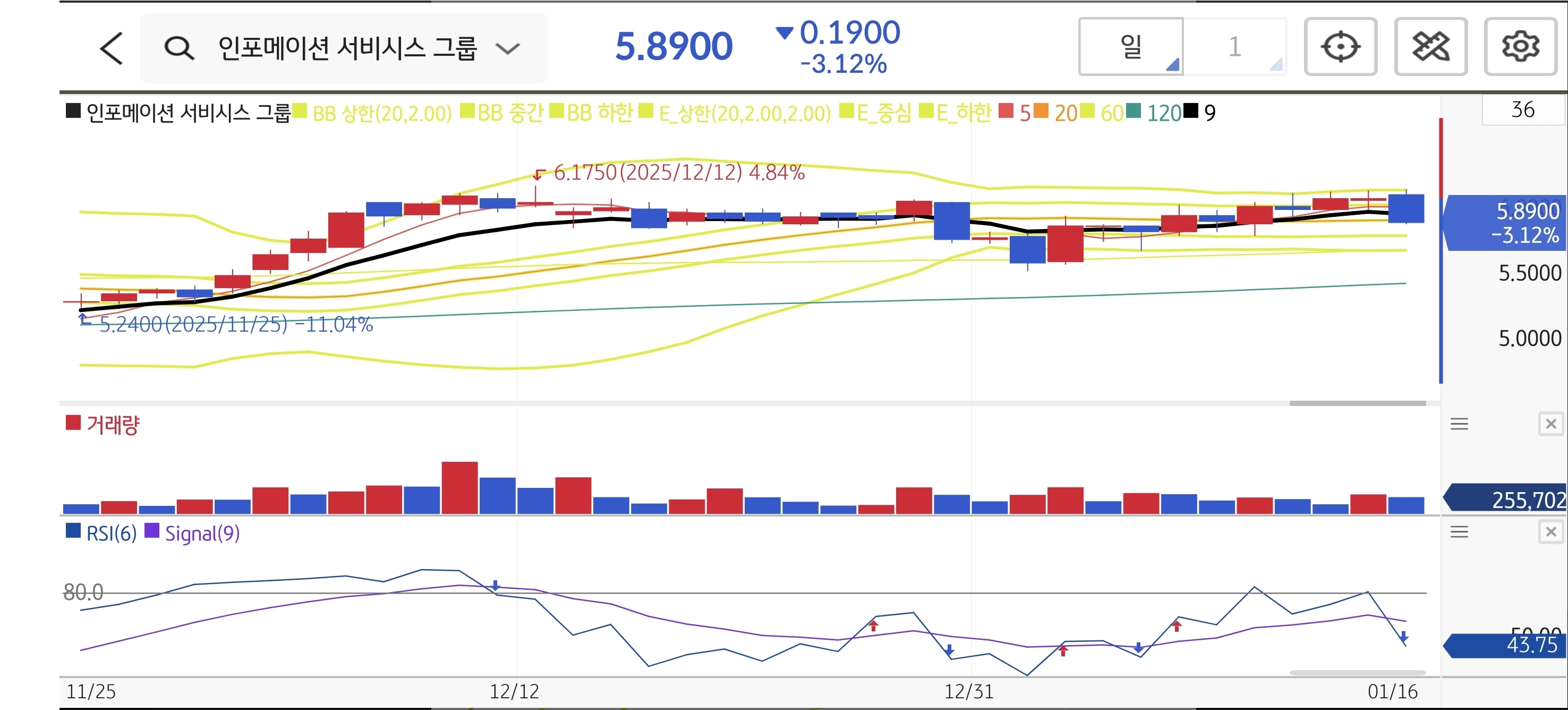 $6.17 고점 이후 건전한 기간 조정을 거치며 20일선과 60일선이 밀집된 구간까지 내려왔습니다. 최근 음봉이 떨어졌지만 거래량이 터지지 않은 '가짜 하락'에 가깝습니다. RSI가 43까지 내려와 과열을 식혔고, 호재와 함께 기술적 반등이 임박한 맥점입니다.