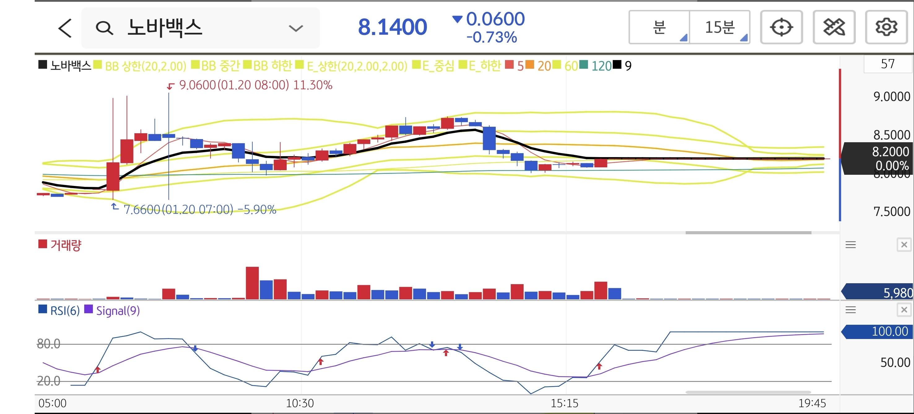 화이자 계약 호재로 인한 갭상승이 예상대로 나왔으나, 시초가($8.22)가 진입 밴드 하단($8.30)보다 살짝 낮게 형성되었습니다. 장 초반 순간적인 슈팅(고가 $9.06 부근)이 나왔으나 이를 지키지 못하고 시초가 부근으로 회귀했습니다. 손절 라인($7.80) 위에서 지지력을 테스트 중입니다. 재료가 소멸된 것이 아니므로, 20일선 지지를 확인하며 보유 관점을 유지합니다.