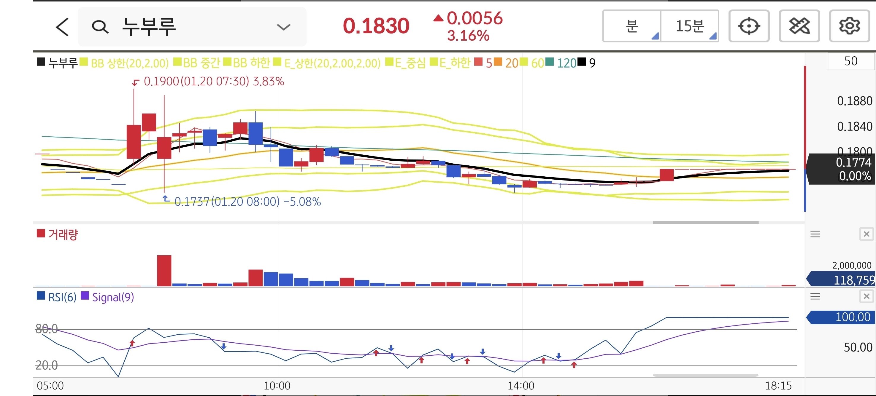 Lyocon 인수 완료 소식에 시초가($0.1812)가 정확히 진입 밴드 내에서 시작되었습니다. 장중 $0.1900까지 상승 시도가 있었으나, 페니주 특유의 매물 압박으로 상승폭을 반납했습니다. 그러나 종가가 여전히 매수 밴드 내에 위치하며 손절 라인($0.150)과는 거리가 멉니다. 바닥권에서의 거래량 유입이 확인되었으므로, 인내심을 갖고 반등을 기다려볼 자리입니다.