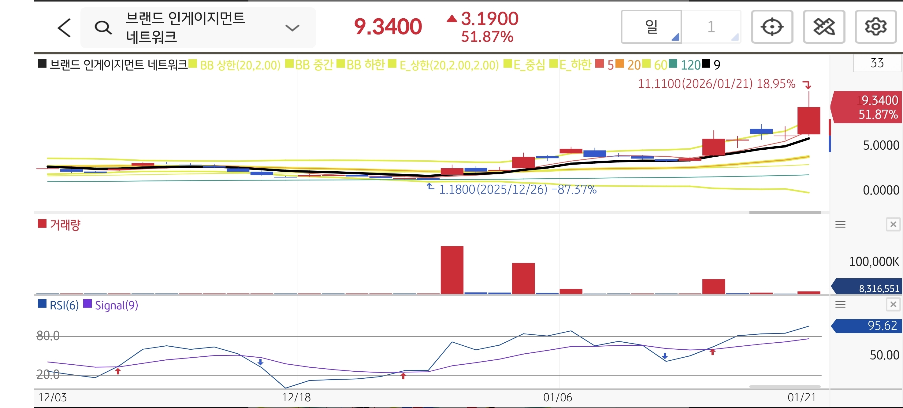$1.18에서 시작된 랠리가 쉼 없이 이어지며 $9.34까지 폭등했습니다. 전일 +51.87%라는 경이로운 상승률을 기록하며 수급이 블랙홀처럼 빨려 들어가는 구간입니다. RSI가 95를 넘는 초과열권이지만, 광기의 영역에서는 기술적 지표가 무의미할 수 있습니다.