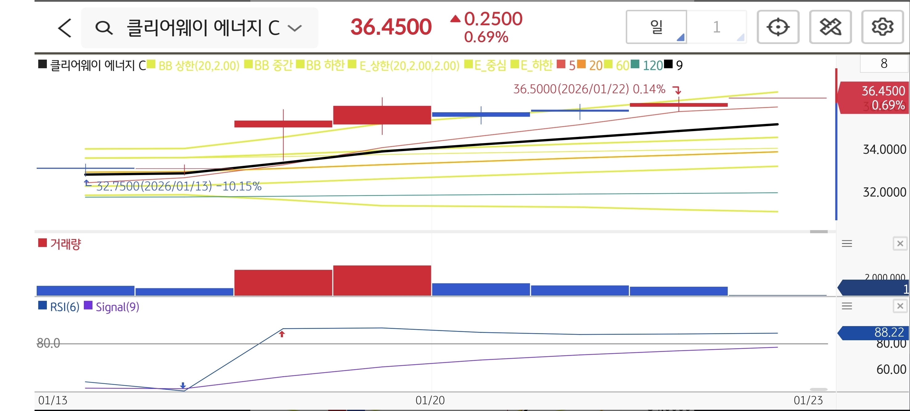 - 📈 기술적 패턴: 구글과의 PPA 체결 호재 이후 완만한 우상향 채널을 그리고 있습니다. $35.00 부근에서 지지를 받고 반등하며 5일선 위를 타고 올라가는 모습이 안정적입니다. RSI 88.22로 과매수권에 진입했으나, 거래량이 꾸준히 유입되며 상승 에너지가 유지되고 있습니다.