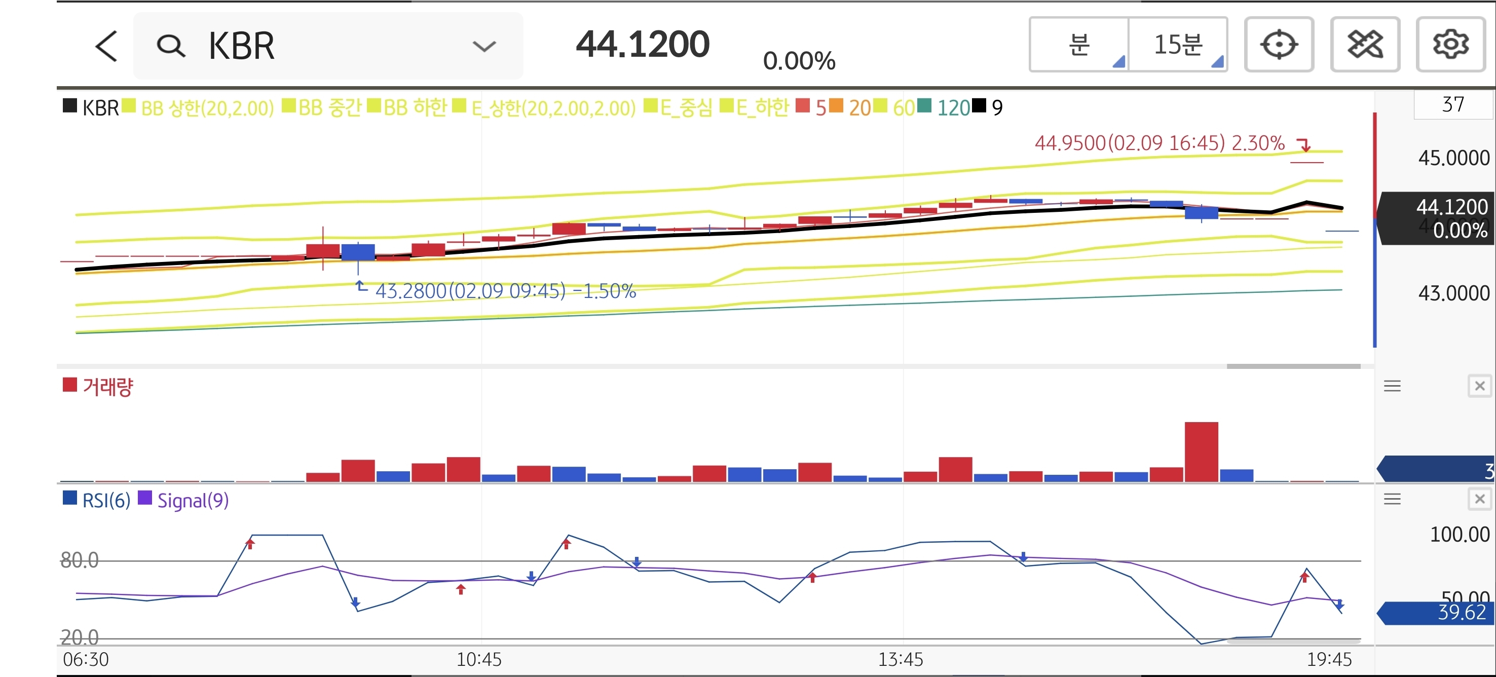 전형적인 '신고가 패턴'의 정석입니다. 시초가($43.38)가 우리가 제시한 매수 밴드 내에서 시작되어 편안하게 진입 가능했습니다. 미 공군 계약 건이 하단을 단단하게 지지해주며 장중 $44.95까지 상승, 1차 목표가($45.36) 턱밑까지 추격했습니다. 급등보다는 추세를 타는 종목입니다. $43 지지선이 확고해진 만큼, 느긋하게 수익을 즐기며 추세 추종(Trend Following) 하시기 바랍니다.