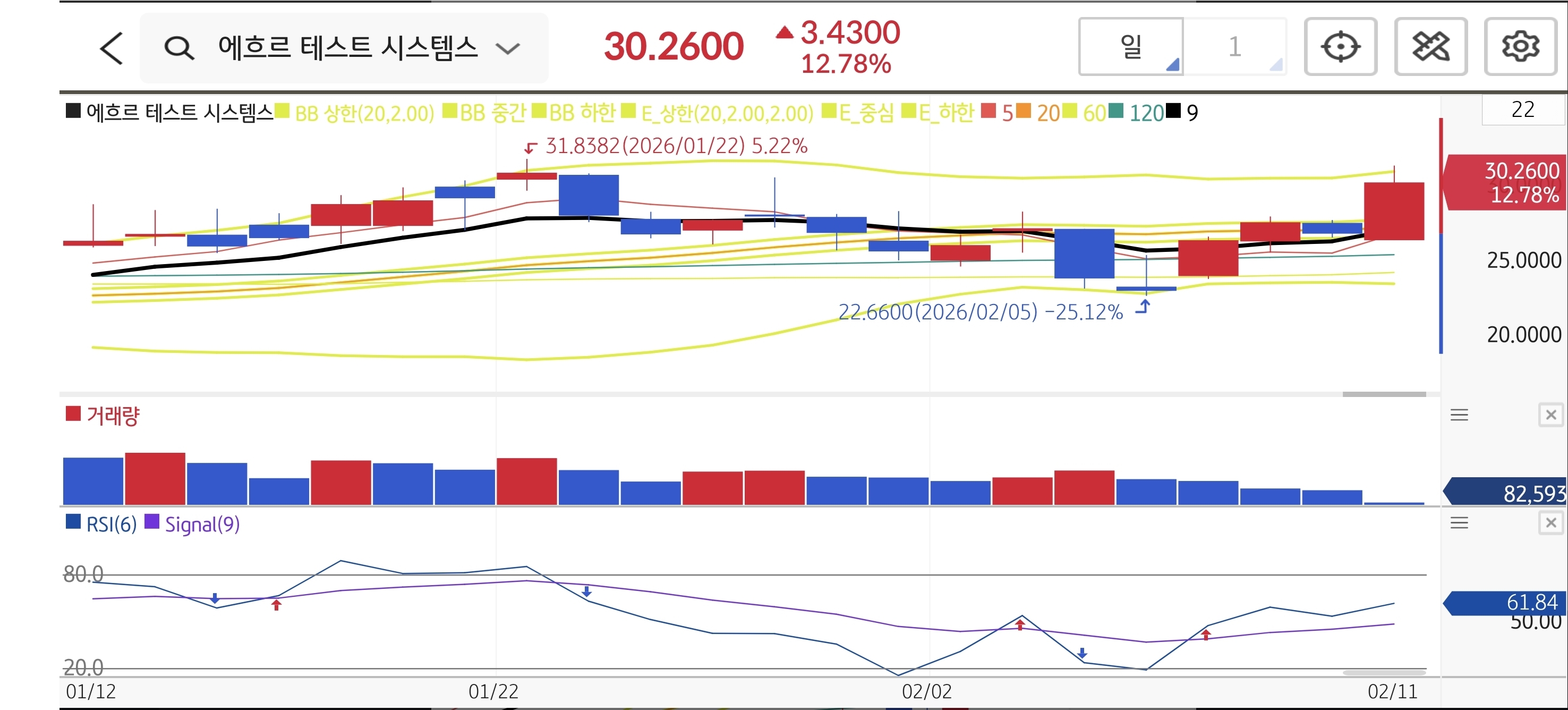 $22.66 저점을 찍고 V자 반등에 성공하며 $30.26(+12.78%)까지 치솟았습니다. 가장 중요한 점은 하락하던 60일선을 강한 거래량을 동반한 장대양봉으로 돌파했다는 것입니다. 이는 중기 추세가 하락에서 상승으로 전환되었음을 의미합니다. RSI(6) 61.84로 상승 여력도 충분합니다.