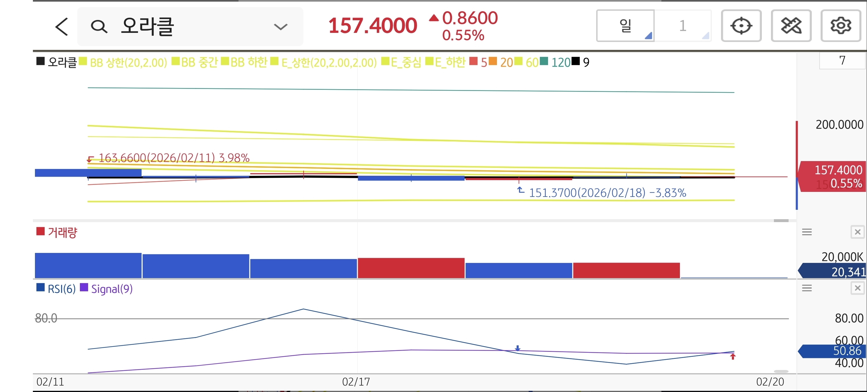 - 📈 기술적 패턴: 미 공군 클라우드 계약 호재가 있었음에도 주가는 약보합(-0.88%)으로 마감했습니다. 차트상 $163 부근에서 단기 고점을 형성한 뒤, 차익 실현 매물에 밀려 $156대까지 내려왔으나, 볼린저 밴드 하단을 깨지 않고 횡보하며 숨을 고르는 모습입니다.