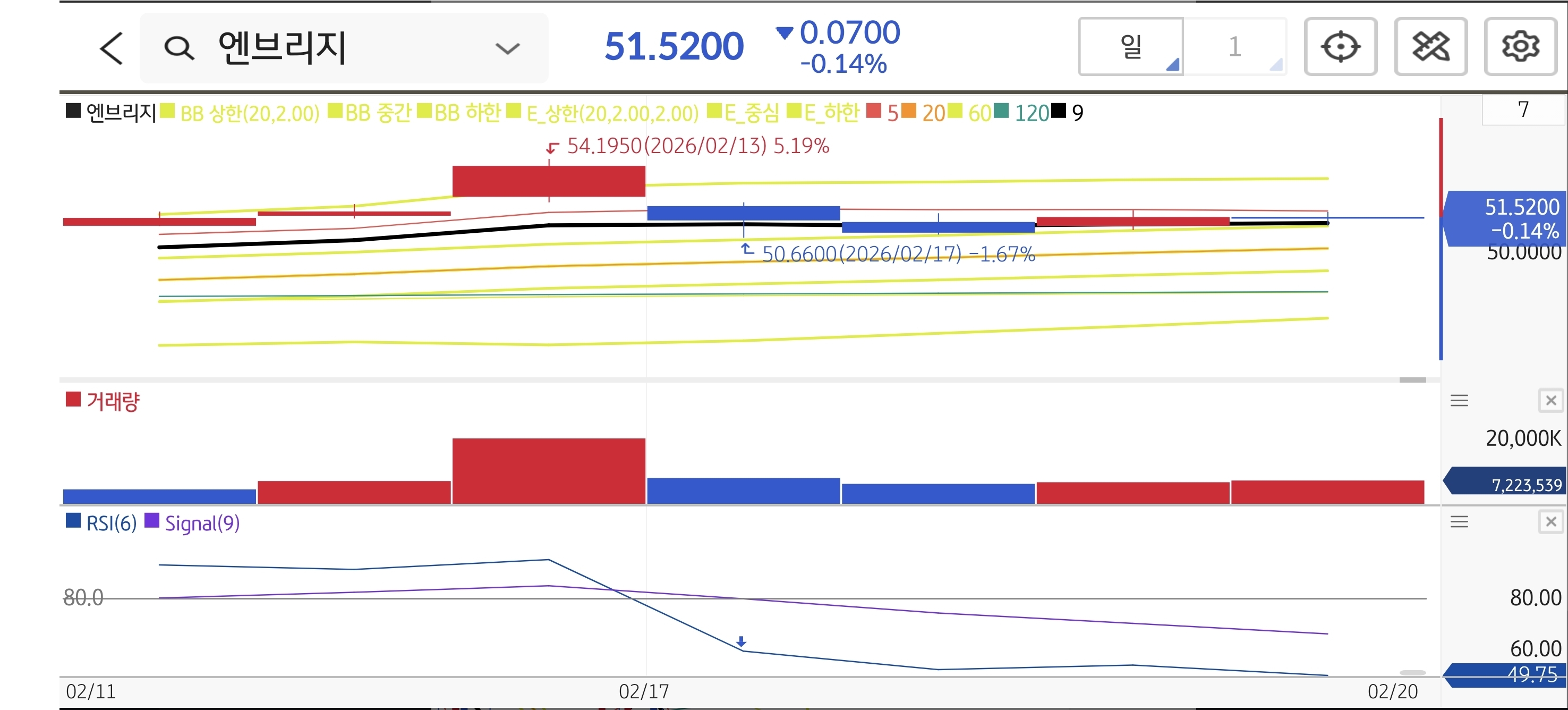 - 📈 기술적 패턴: $52.50 고점을 찍은 후, 거래량이 실린 음봉이 출현하며 단기 이동평균선(5일, 20일)을 하향 이탈했습니다. RSI 지표 역시 고점에서 꺾이며 단기 조정 국면에 진입한 모습입니다(-1.87%).