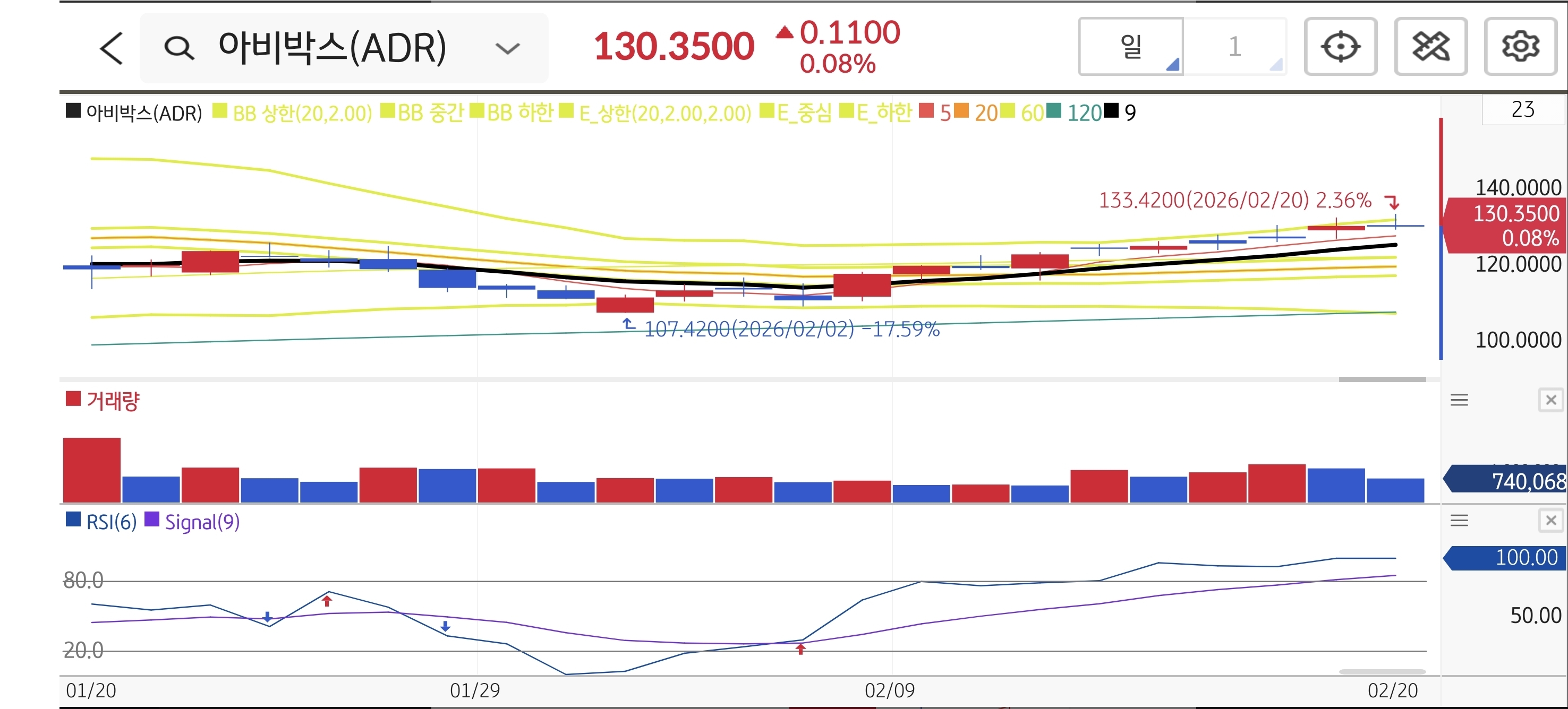 $107.42 부근에서 완벽한 라운딩 바텀(둥근 바닥)을 형성한 뒤, 5일선과 20일선을 타고 우상향하는 전형적인 정배열 상승 차트입니다. 주가가 $130을 돌파하며 신고가 랠리 영역에 진입했고 위로 저항 매물이 매우 얇습니다. 매수세가 압도적이어서 추세가 당분간 지속될 모양새입니다.
