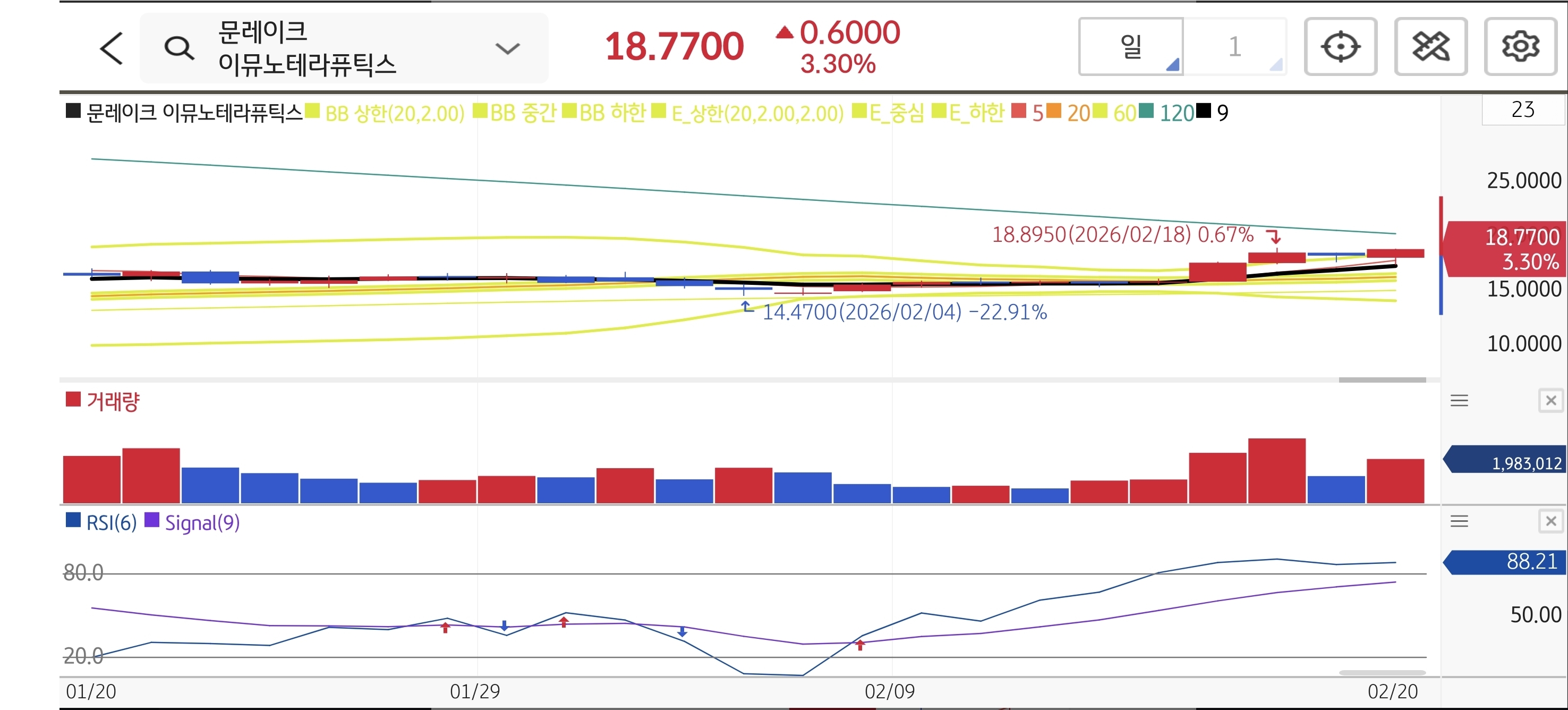 바닥($14.47)을 단단하게 다진 후 최근 거래량이 점진적으로 증가하며 모든 이동평균선을 발아래 두는 긍정적인 흐름이 발생했습니다. 주가가 $18.89 전고점 부근의 악성 매물대를 강하게 소화하고 있으며, RSI(6)가 88.21로 강한 매수 우위를 보여주고 있어 추가 슈팅이 유력한 가벼운 차트입니다.