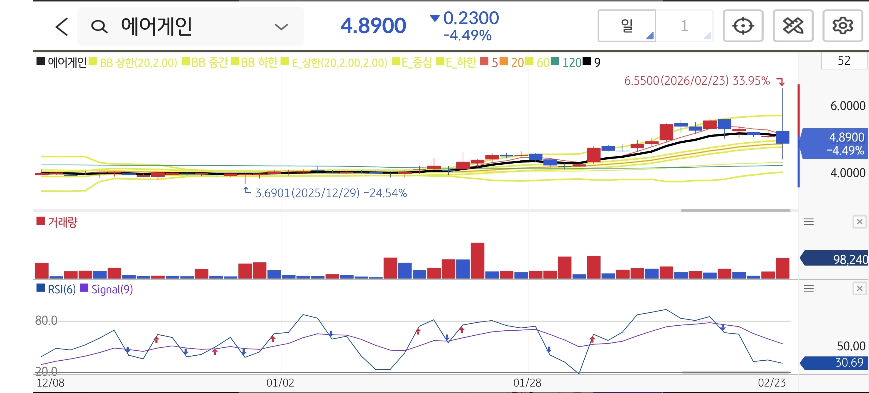 이동평균선이 완벽한 정배열을 유지한 채 5일선을 타고 가파르게 우상향하는 '교과서적인 상승 추세'입니다. 전고점을 뚫고 신고가($9.00) 영역에 진입했으며, 거래량이 점진적으로 늘고 있어 추가 슈팅 여력이 충분해 보입니다. RSI(6)가 85.85로 단기 과열권이나 상승 관성이 강해 당분간 쉽게 꺾이지 않을 차트입니다.