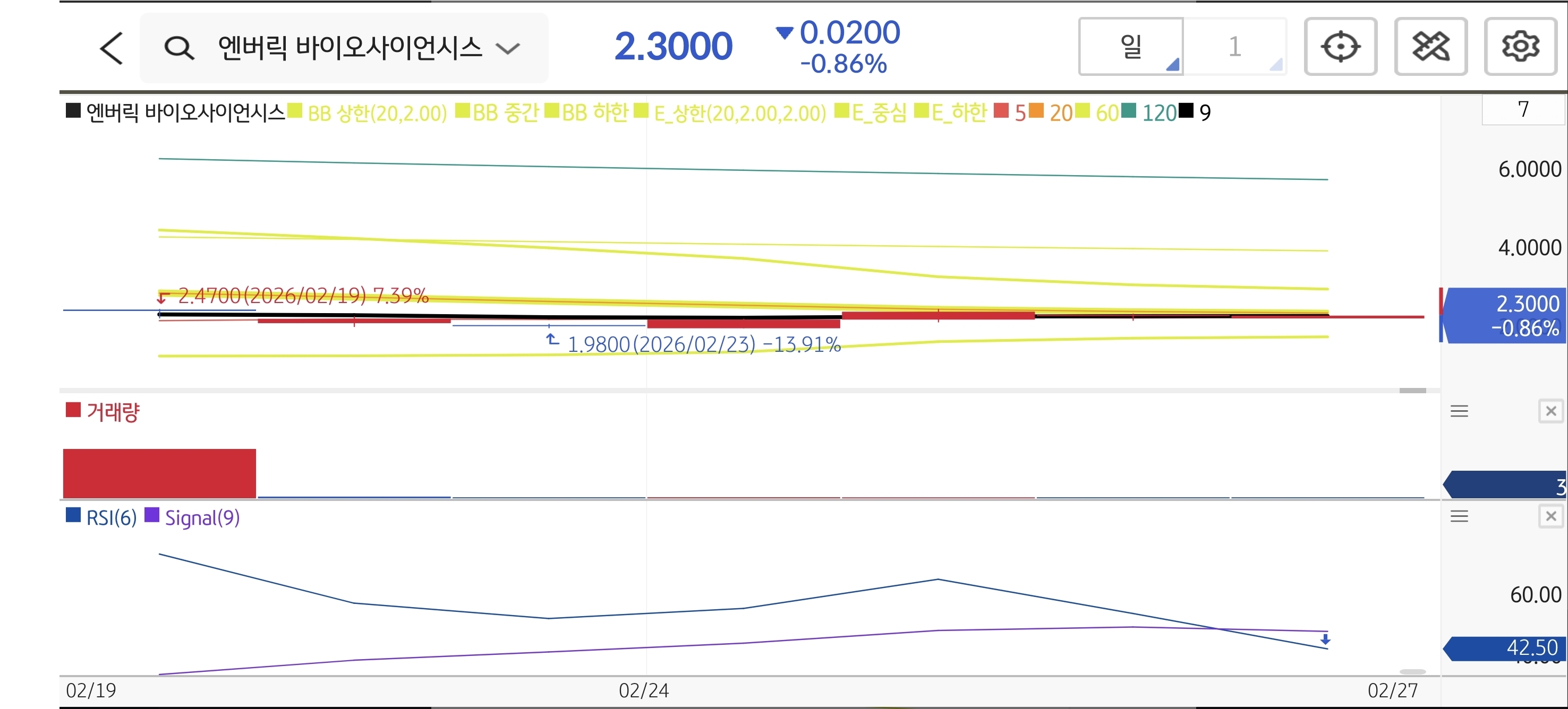 - - 📈 기술적 패턴: 유효성 데이터 확보 소식에 시초가 2.455달러로 강하게 시작 후 2.47달러를 터치했습니다. 하지만 역시 대량의 거래량이 터지며 음봉으로 마감했고, 1주일 내내 2.3달러 선까지 계단식 하락을 보였습니다.