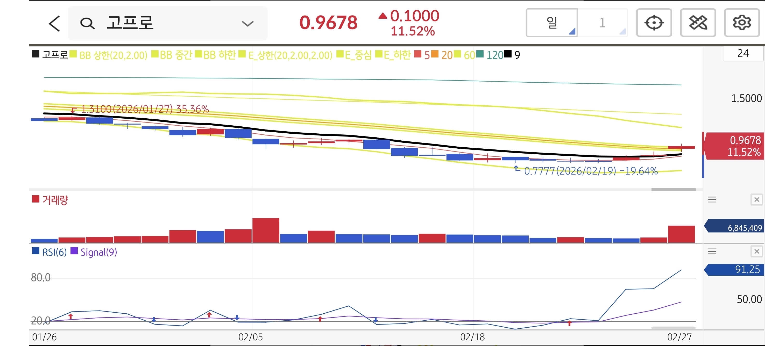 끝없이 흘러내리던 일봉상 역배열 추세를 평소 대비 수십 배 폭증한 대량 거래량과 함께 장대양봉으로 돌파하며 고개를 들었습니다. RSI가 91.25로 단기 과열권에 진입할 만큼 매수세가 공격적이며, 1달러 지폐주 복귀를 앞두고 심리적 저항선 돌파를 강하게 시도하고 있습니다.