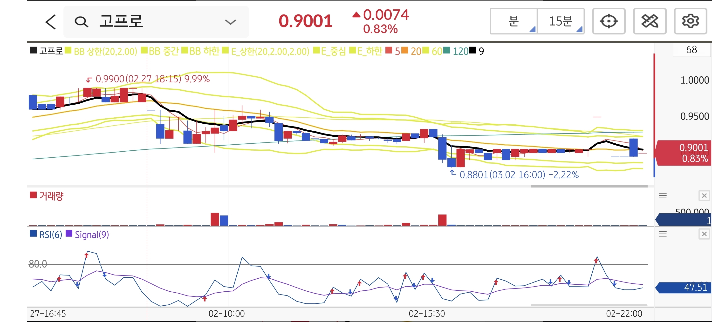 장중 0.99달러까지 반등을 시도했으나 1차 목표가 1.10달러 달성에는 실패했습니다. 저가 역시 0.88달러로 방어되며 손절가 0.80달러를 이탈하지 않았습니다. 진입가 부근에서 횡보 중인 흐름이므로 대기로 판정합니다.