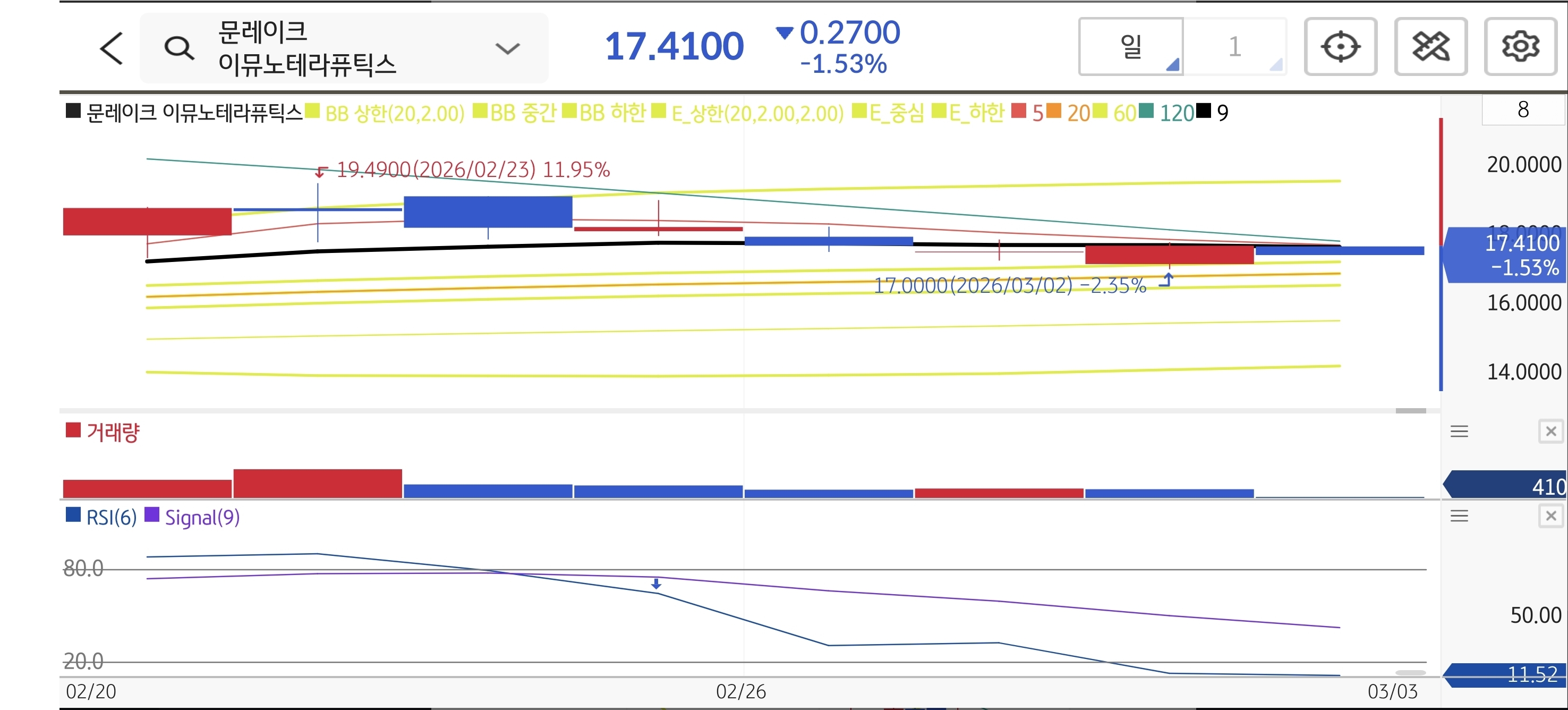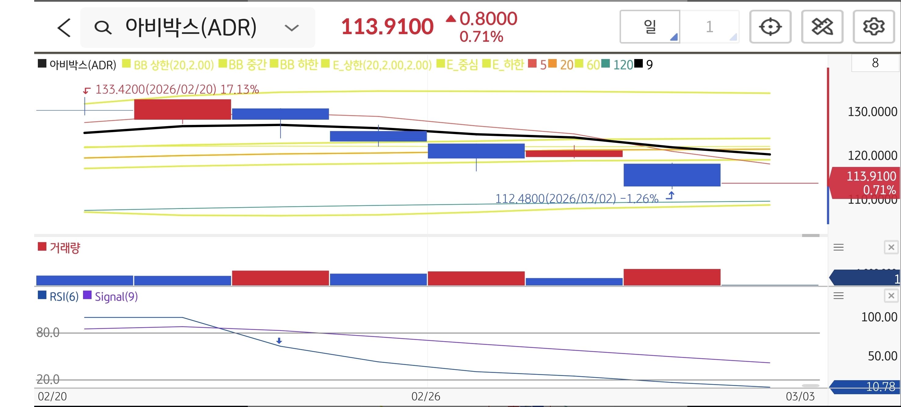 - 📈 기술적 패턴: 2월 20일 급등으로 갭상승을 띄운 뒤, 23일 추가 상승 없이 고점에서 매도 물량이 출회되며 음봉으로 마감했습니다. 단기 급등에 따른 피로감이 보이며 5일선이 하향 돌파되었습니다. 거래량이 감소하며 매수 동력이 약화되었습니다.