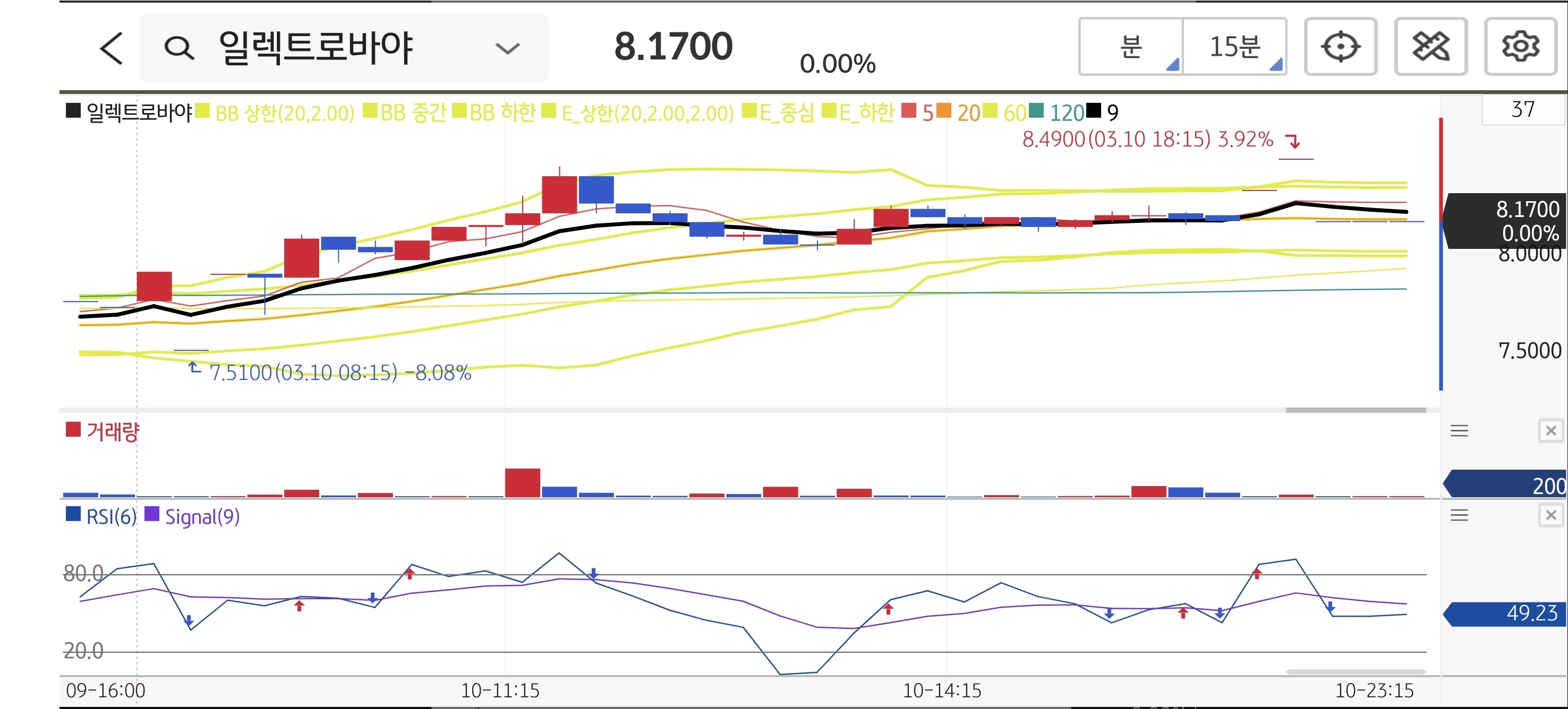 15분봉 흐름을 보면 장중 고가 8.49달러를 기록하며 제시했던 단기 저항 구간인 8.30달러를 장 초반 시원하게 돌파했습니다. 장중 저가는 7.51달러로 손절가인 7.00달러를 넉넉하게 지켜냈고, 종가 역시 시초가 대비 6.24% 상승한 8.17달러로 마감하며 강력한 매수세가 유입됨을 증명했습니다.