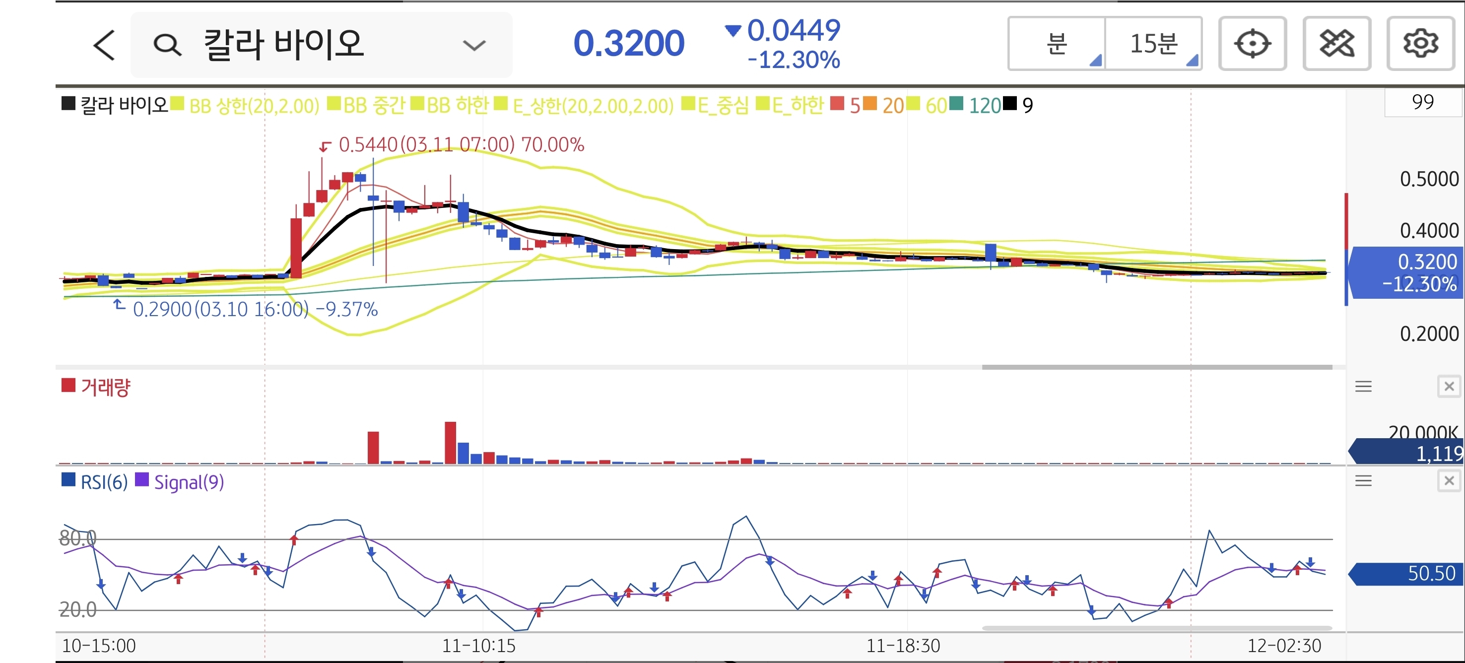 15분봉상 장중 고가 0.54달러를 찍으며 급등했으나 단기 저항 구간인 0.60달러 돌파에는 실패했습니다. 이후 강력한 매도세가 쏟아지며 장중 저가 0.29달러를 기록해 추세 이탈 라인인 0.35달러를 완전히 붕괴시켰습니다. 예고했던 대로 변동성 극대화 구간에서 기계적인 원칙 대응이 필수적이었던 종목입니다.