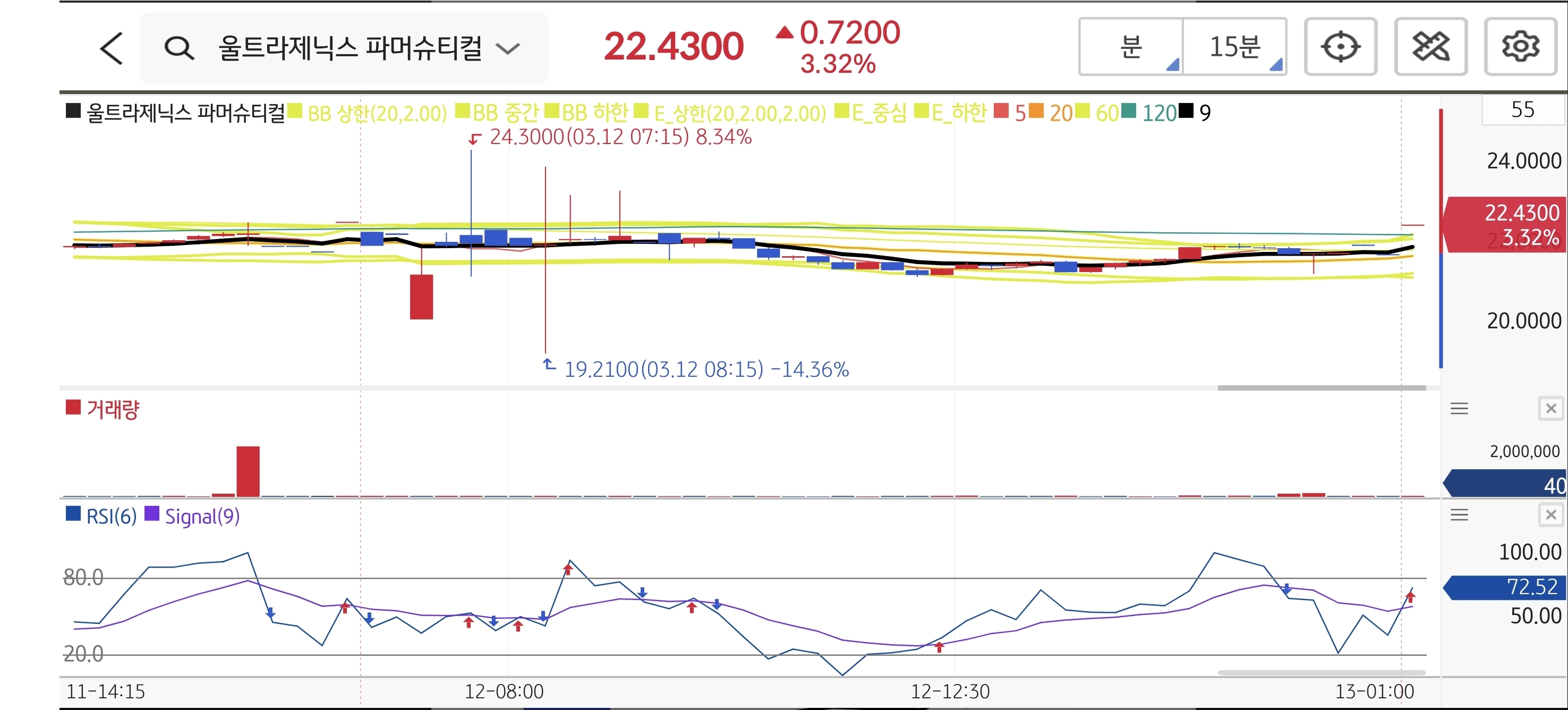 전일 부각된 파이프라인 임상 데이터 호재에 힘입어 장 초반부터 강한 매수세가 유입되었습니다. 15분봉 차트를 확인해 보면 장중 최고가 24.30달러를 기록하며 목표가로 설정했던 단기 저항 구간에 정확히 도달하는 훌륭한 흐름을 보여주었습니다. 이후 단기 매물이 출회하며 장중 19.21달러까지 밀리기도 했지만, 핵심 지지선인 추세 이탈 라인 19.20달러를 이탈하지 않고 방어해낸 점이 긍정적입니다. 펀더멘털과 기술적 흐름 모두 양호하므로 스윙 관점의 접근이 계속해서 유효합니다.