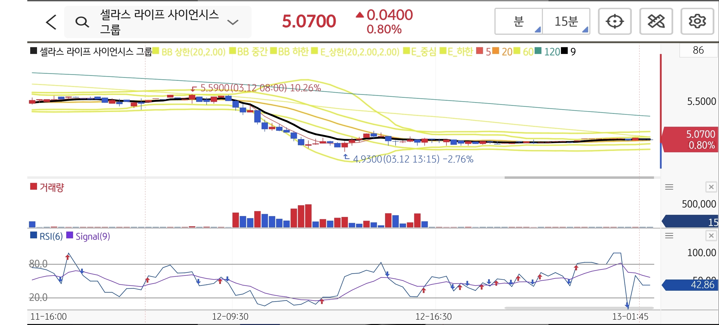 전일 발표된 파트너십 및 임상 진행 모멘텀이 존재함에도 불구하고, 전반적인 제약 바이오 섹터의 수급 이탈 현상에 아쉬운 모습을 보였습니다. 15분봉 차트 흐름을 살펴보면 장중 5.59달러까지 반등을 시도했으나 목표가인 6.15달러에는 미치지 못하고 저항에 부딪혔습니다. 다만 하락 파동 속에서도 장중 최저가 4.93달러를 기록하며 추세 이탈 라인인 4.50달러를 견고하게 지켜냈습니다. 현재 종가가 진입가 부근인 5.03달러에서 지지를 테스트하고 있으므로, 원칙적인 손절가를 엄수하며 흐름을 관망하는 대기 전략을 유지하시길 바랍니다.