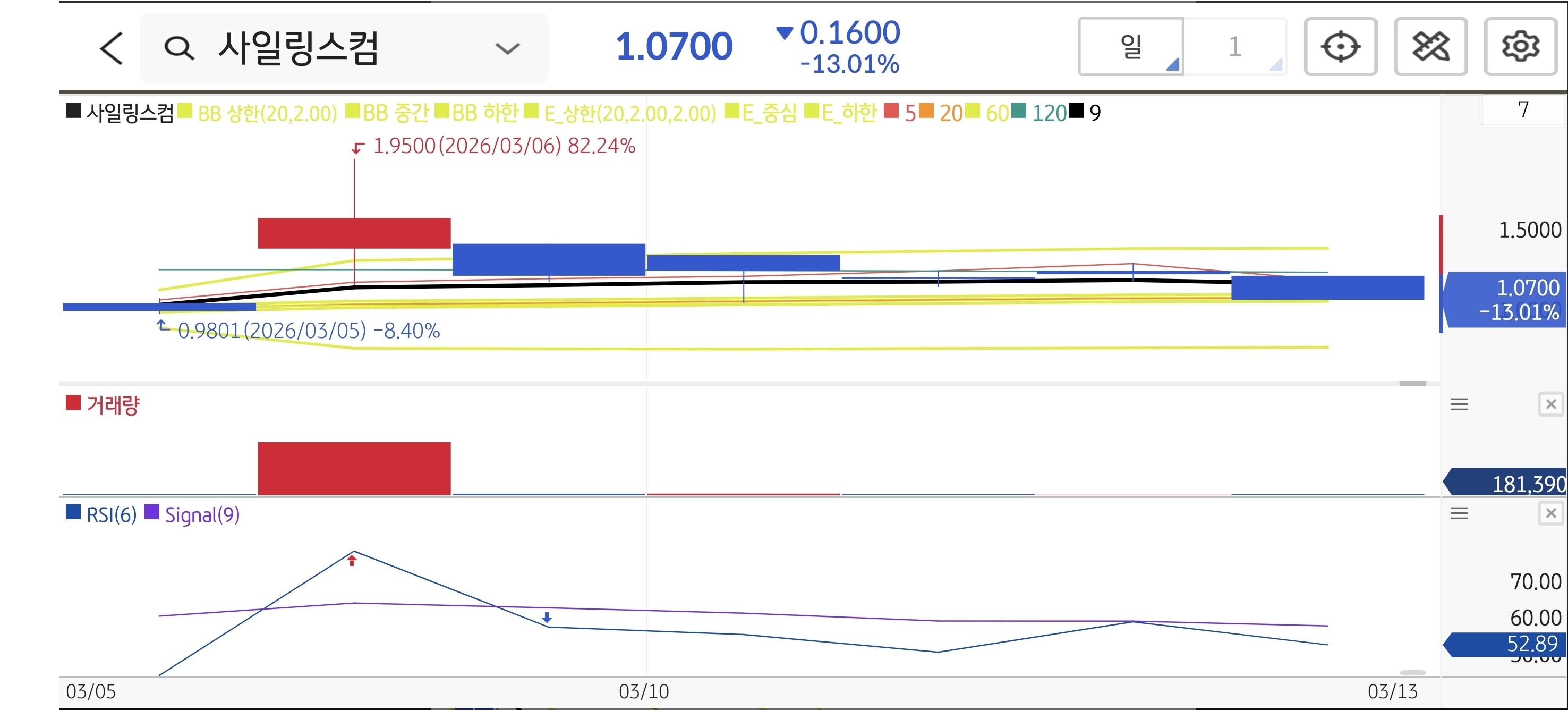 -14.86%- 🧐 변동 이유: 통신 기술 최종 채택이라는 훌륭한 재료에도 소형 방산주의 한계로 수급이 빠르게 빠져나감.
