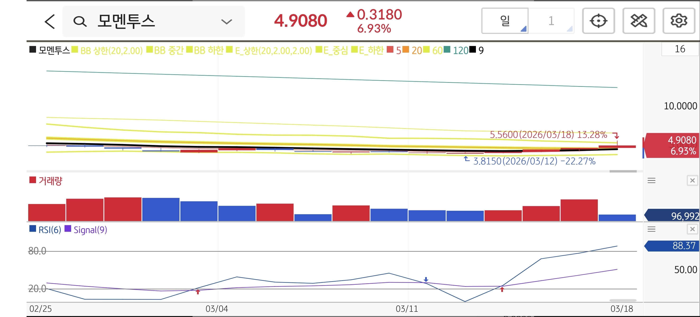 바닥권인 3.8달러 부근에서 완벽하게 탈출하며 거래량이 지속적으로 실리는 전형적인 우상향 채널을 구축 중입니다. 다만, 단기 급등으로 인해 일봉상 RSI가 88 부근의 극심한 과매수권에 진입해 있어 갭 상승 이후 단기 차익 실현 매물이 쏟아질 가능성을 배제할 수 없습니다. 전고점 돌파를 눈앞에 두고 있으나 섣부른 추격 매수보다는 건전한 눌림목을 기다리는 여유가 필요합니다.