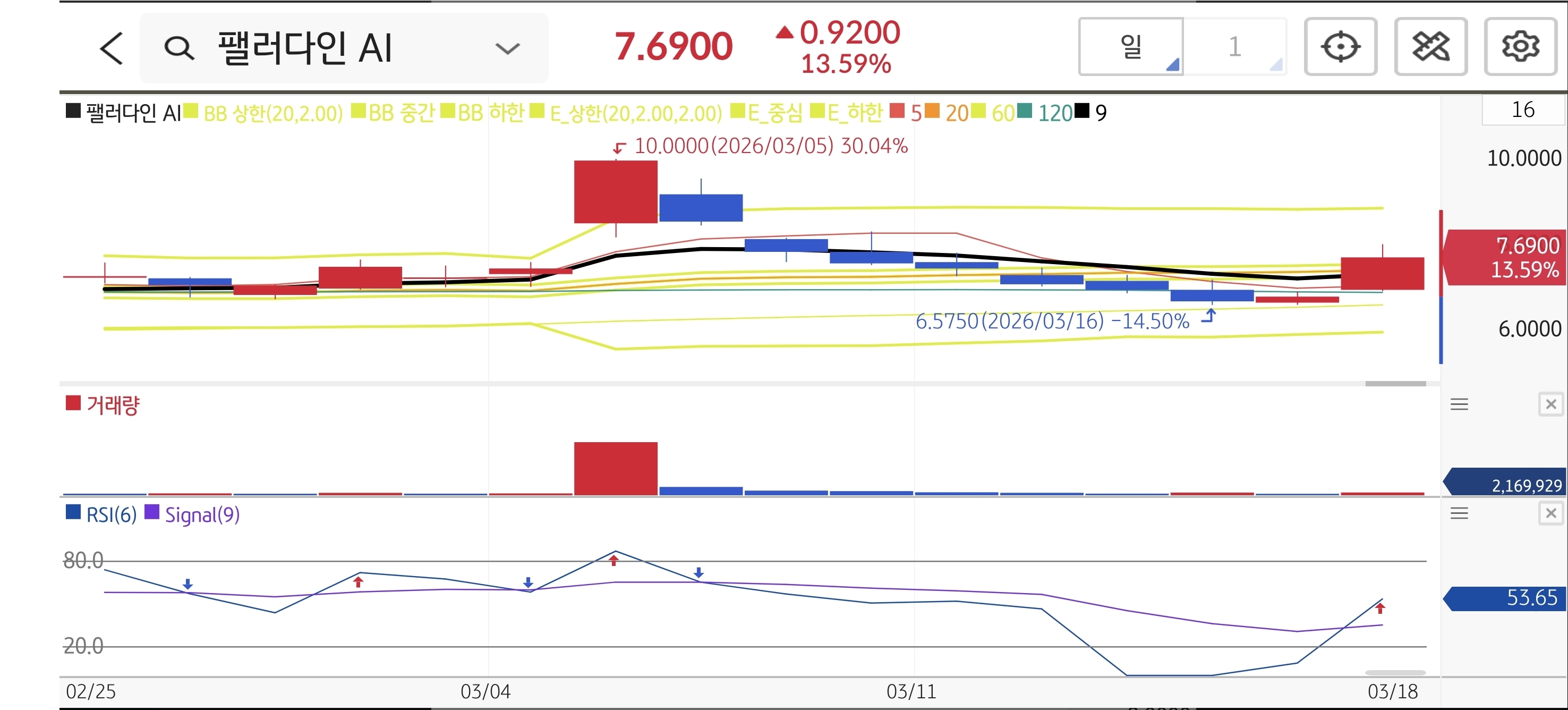 일봉상 6달러 후반의 강력한 지지선을 딛고 대량 거래량을 동반하며 고개를 들었습니다. 단기 하락 추세를 끊어내는 13%대 급등 양봉이 출현했으며, 상단 매물대가 얇아진 구간이라 호재의 힘으로 이전 고점인 10달러 부근까지도 가볍게 튀어 오를 수 있는 폭발적인 자리입니다. 현재 RSI는 53 부근으로 과열권 진입 전까지 충분한 상승 여력이 남아있습니다.