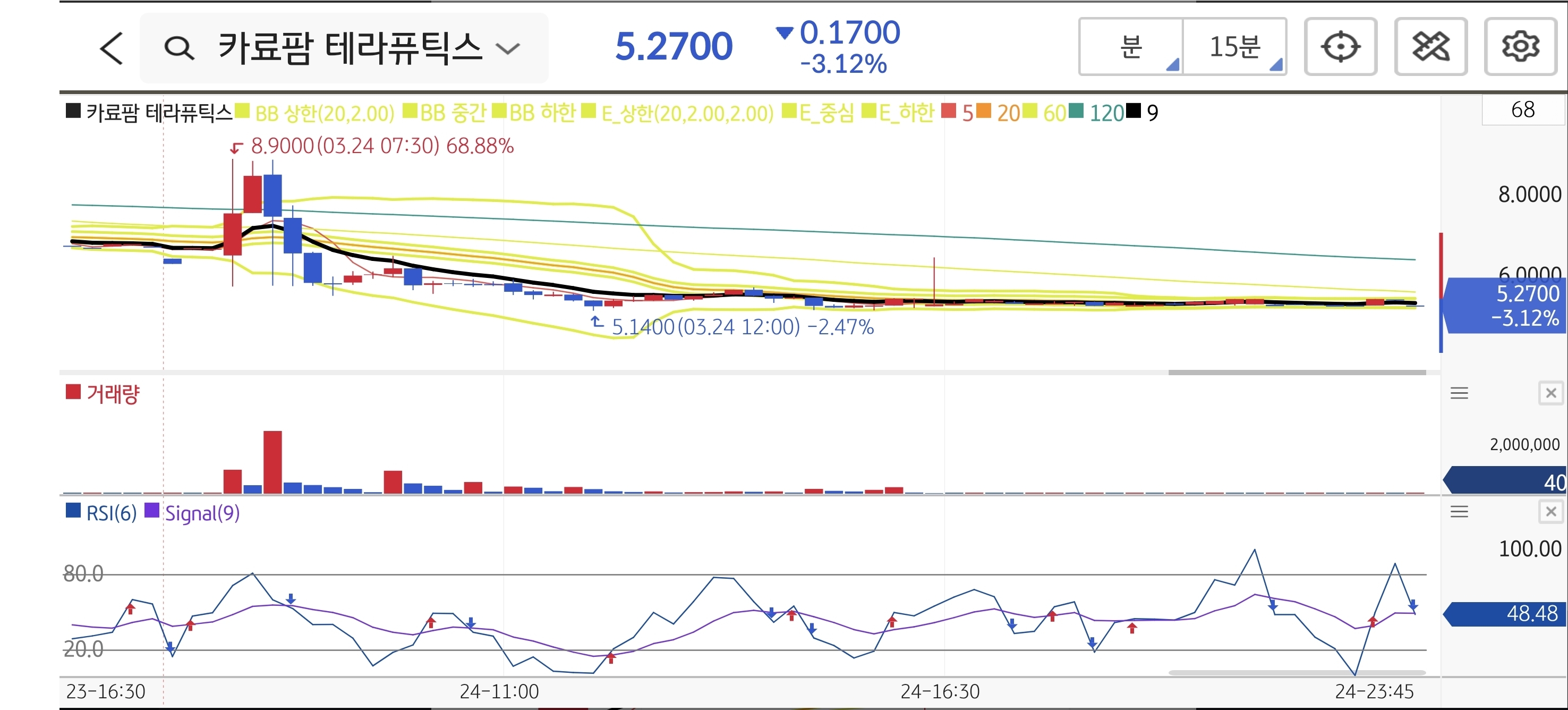장 초반 8.90달러까지 치솟는 변동성을 보였으나 이후 매도 물량이 쏟아지며 하락 전환했습니다. 골수섬유증 임상 3상에서 유의미한 결과를 확보했다는 뉴스에도 불구하고, 세부 내용이 실질적으로는 절반의 성공에 가깝다는 시장의 냉혹한 재평가가 반영되며 실망 매물이 출회된 것으로 분석됩니다. 결국 장중 최저가 5.14달러를 기록하며 제시했던 추세 이탈 라인인 5.70달러를 하향 이탈하여 손절 판정되었습니다. [분류: 소형주]