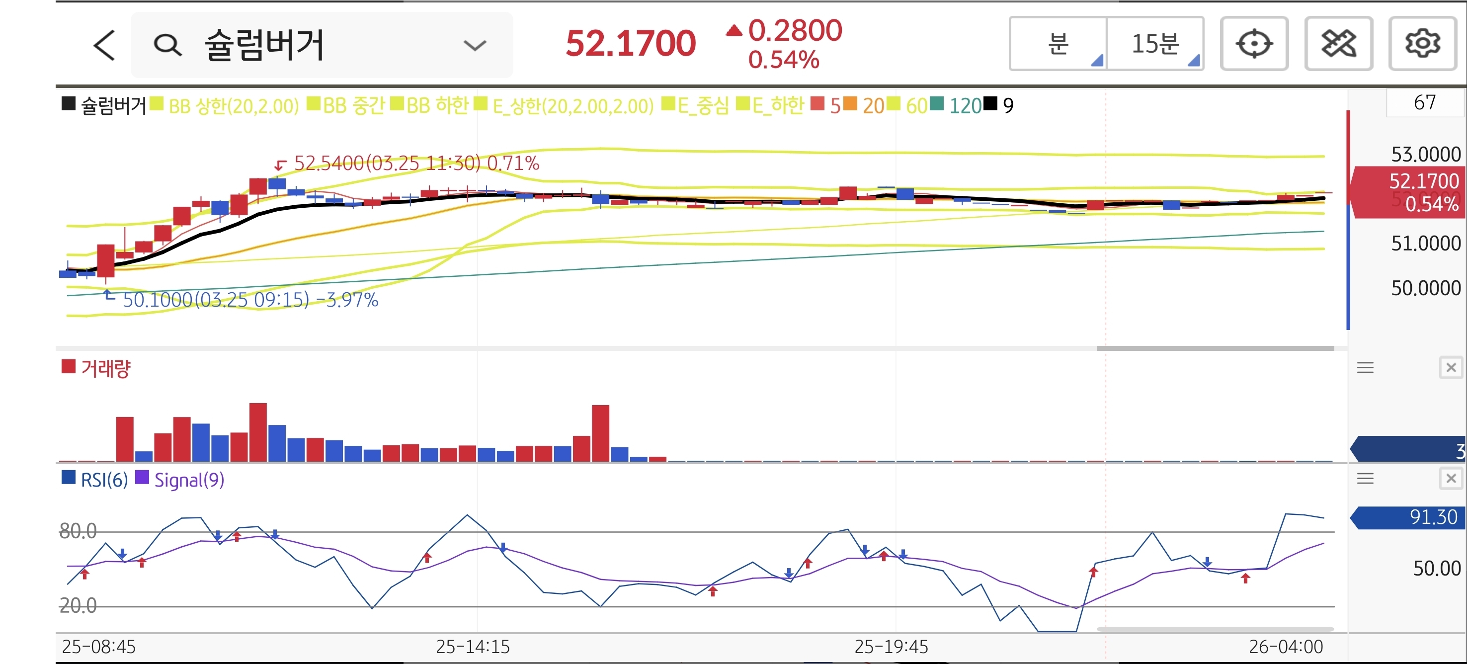 엔비디아와 에너지 산업 전반에 인공지능 상용화를 추진한다는 강력한 전일 뉴스가 턴어라운드 모멘텀으로 작용하여 장 초반 매수세를 이끌어냈습니다. 5분봉 차트상 장중 최고가 52.54를 기록하며 제시된 단기 저항 구간인 52.45를 장 초반에 돌파했습니다. 장중 최저가는 50.10 수준으로 추세 이탈 라인인 46.00을 넉넉히 방어하며 안정적인 지지력을 보여주었습니다.