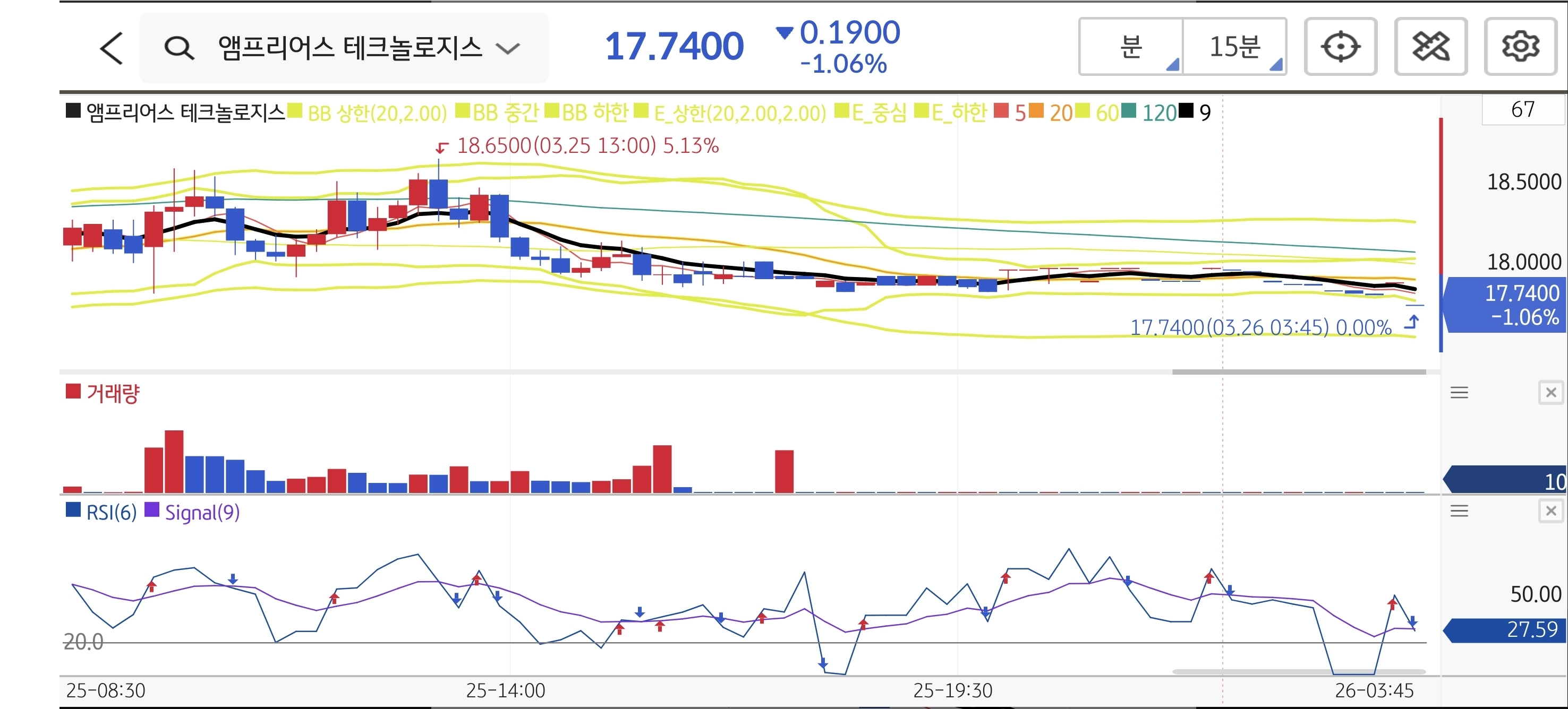 전기 이륜 및 삼륜차용 대규모 구매 주문 확보라는 호재로 장 초반 상승 출발을 시도했으나, 단기 급등에 따른 피로감으로 매물이 출회되며 지지선을 테스트하는 흐름이 이어졌습니다 15분봉 차트상 장중 최고가 18.65를 기록하여 단기 저항 구간인 19.76에는 도달하지 못했습니다. 이후 하락세를 보였으나 장중 저가가 17.74 부근에서 방어되며 추세 이탈 라인인 15.50을 깨지 않고 관심 지지 구간인 17.00 위에서 가격을 형성했습니다.