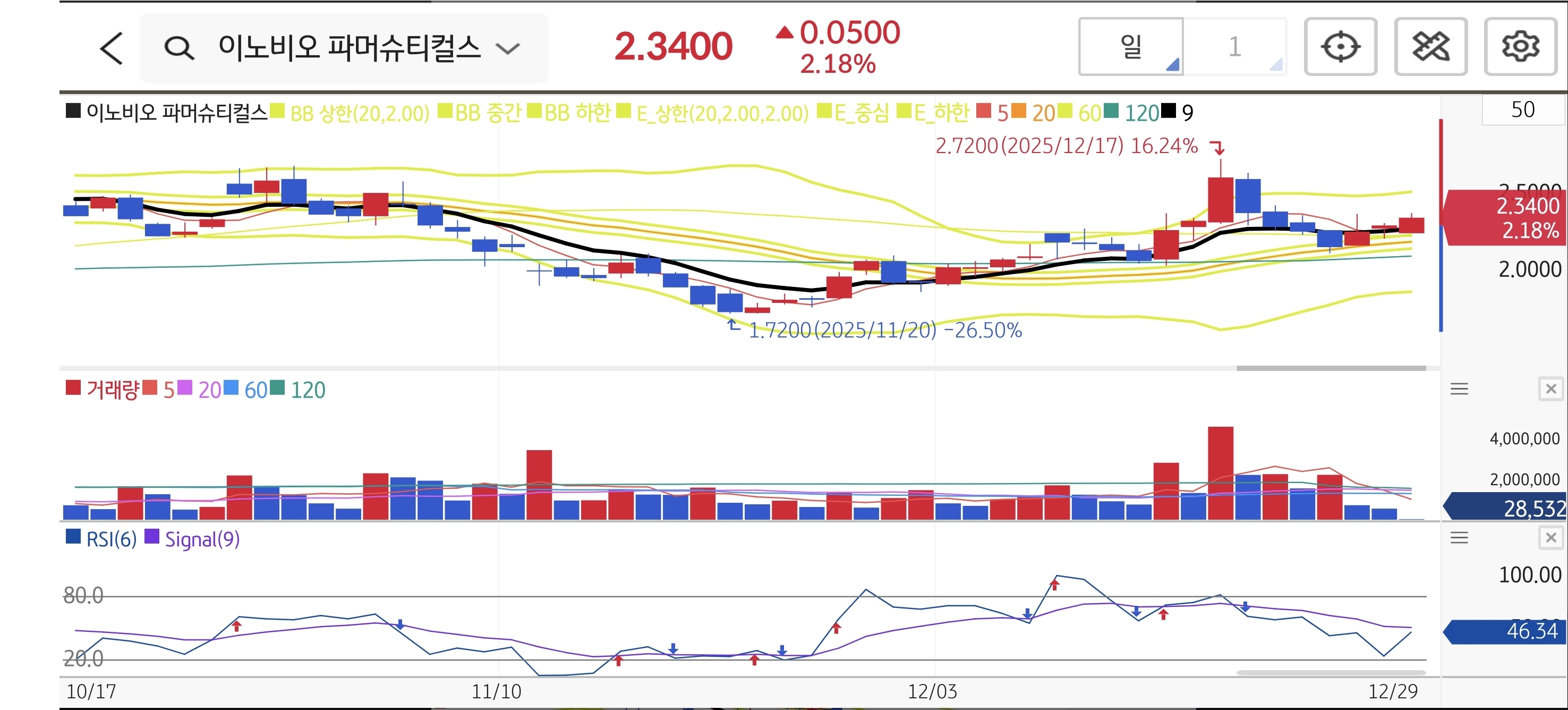 $1.72 최저점을 찍고 V자 반등에 성공하여 $2.34까지 올라왔습니다. 현재 20일선과 60일선이 골든크로스를 만들며 추세 전환의 초입에 진입했습니다. 전고점인 $2.72 부근의 매물대만 소화한다면 위쪽으로 열려있는 구간입니다.