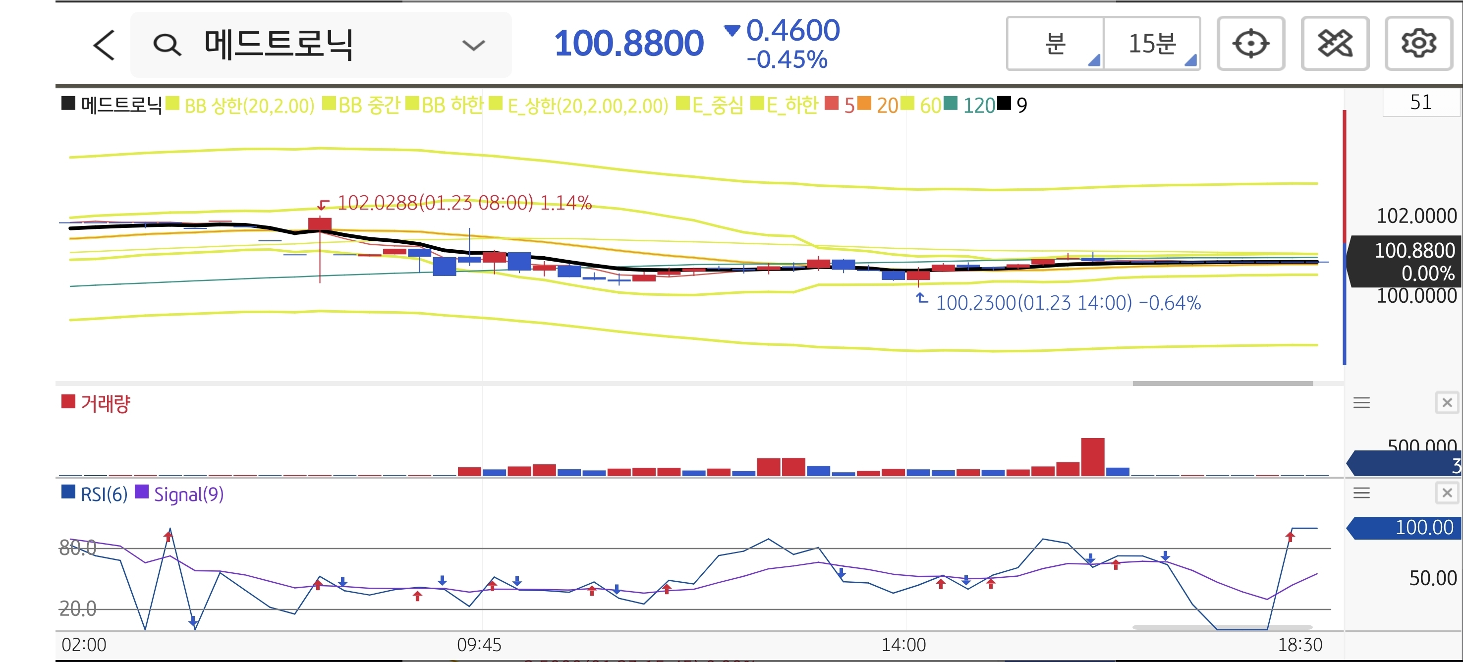 유럽 승인 호재가 주가 하단을 지지했습니다. 시초가가 $101.01로 진입 추천가 최하단에서 시작해 매수 기회를 주었습니다. 장중 $102.02까지 상승하며 단기 수익(+1.0%)을 안겨주었습니다. 종가는 보합권($100.88)으로 밀렸지만, 손절 라인($99.00)을 넉넉히 지켜내며 상승 추세를 유지 중입니다. 스윙 관점에서 여전히 매력적인 보유 구간입니다.