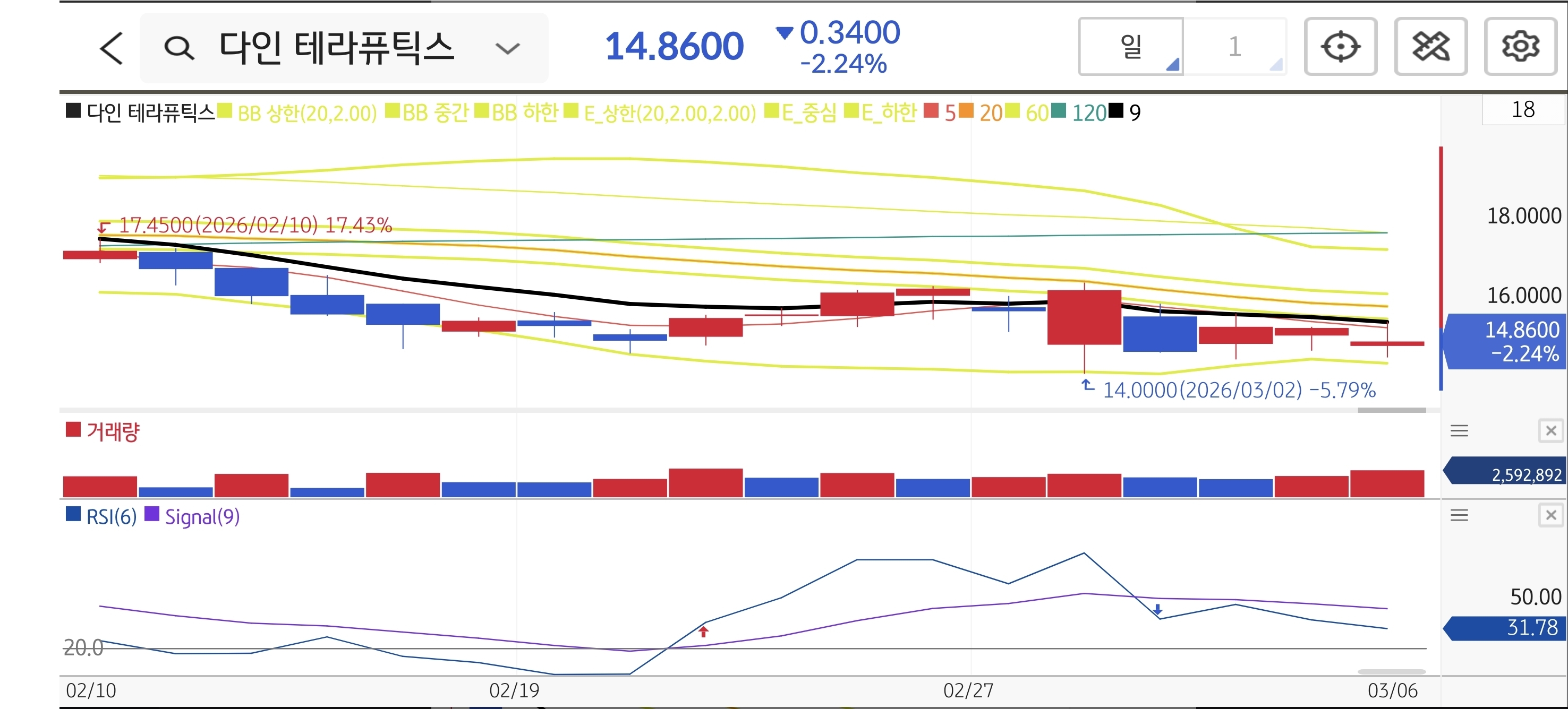 일봉상 주가가 하락 채널을 그리며 하단 밴드를 터치한 후 지지력을 강하게 테스트하고 있습니다. 14달러 부근에서 하방 경직성을 확보했으며, RSI 지표가 31 부근에서 침체권을 벗어나며 고개를 들고 있어 매수 시그널을 보내고 있습니다. 역배열 상태지만 이번 임상 호재가 강력한 반등 트리거로 작용해 단기 이평선 회복을 시도하는 전형적인 턴어라운드 자리입니다.