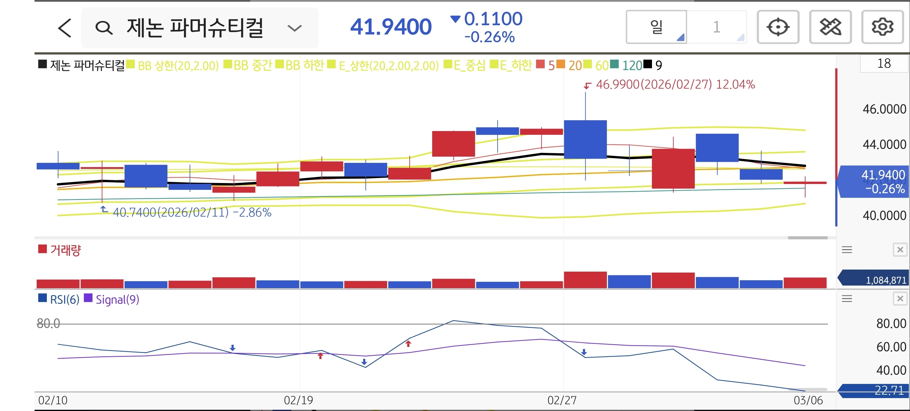 46달러 고점 달성 후 차익 실현 매물이 나오며 단기 눌림목 구간에 깊게 진입했습니다. 현재 RSI가 22 부근으로 극심한 과매도 상태를 가리키고 있어 언제든 기술적 반등이 튀어 오를 수 있는 자리입니다. 하단 지지선 부근에서 임상 발표 기대감과 맞물려 저가 매수세가 유입될 가능성이 매우 높습니다.
