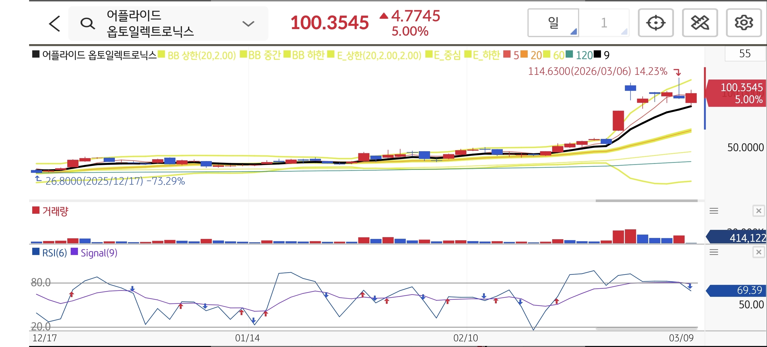 일봉상 114달러 고점을 찍고 100달러 라운드 피겨 부근에서 건전한 숨고르기를 진행 중입니다. 이평선이 완벽한 정배열을 유지하고 있고, RSI가 과열권에서 69 부근으로 식혀지며 재차 에너지를 응축하는 모습입니다. 악성 매물이 얇아 소화 후 재돌파가 기대되는 정석적인 눌림목 타점입니다.