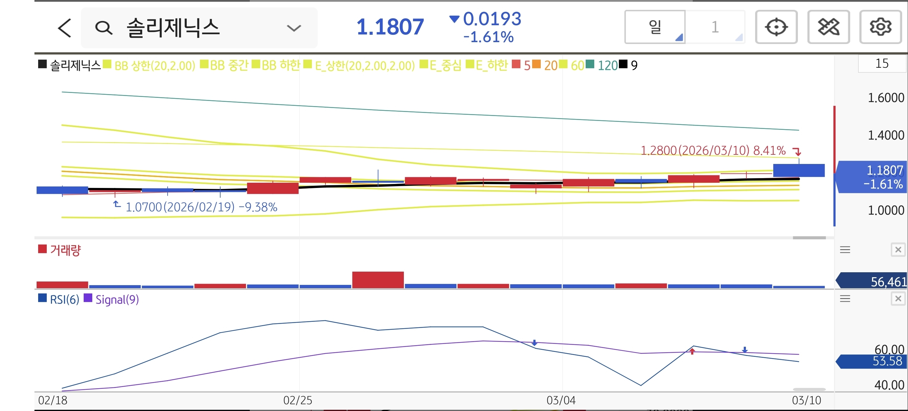 일봉상 긴 횡보 박스권을 거치며 1달러 부근에서 바닥을 단단하게 다졌습니다. RSI가 50 위로 올라서며 매수 우위를 점하고 있고, 상단 매물대가 얇아 호재 한 방이면 저항 없이 신고가 갱신으로 강하게 튀어오를 수 있는 급등 초입 자리입니다.