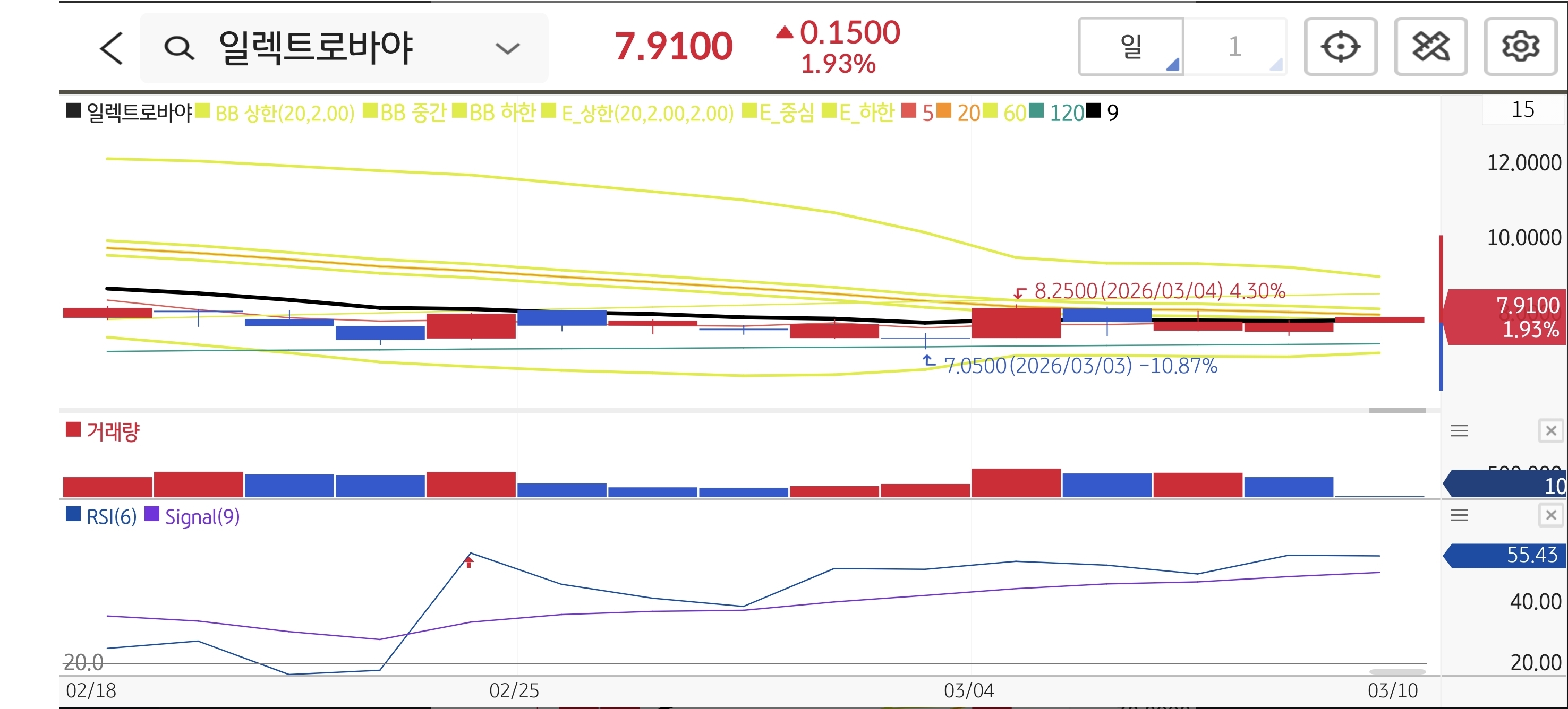 일봉상 7달러 초반에서 쌍바닥을 찍고 고개를 들었습니다. 단기 이평선이 밀집된 구간을 거래량과 함께 뚫어내며 우상향 변곡점을 만들고 있습니다. RSI 역시 55 부근으로 추가 상승 여력이 충분하며 매수세가 점진적으로 유입되는 안정적인 눌림목 타점입니다.